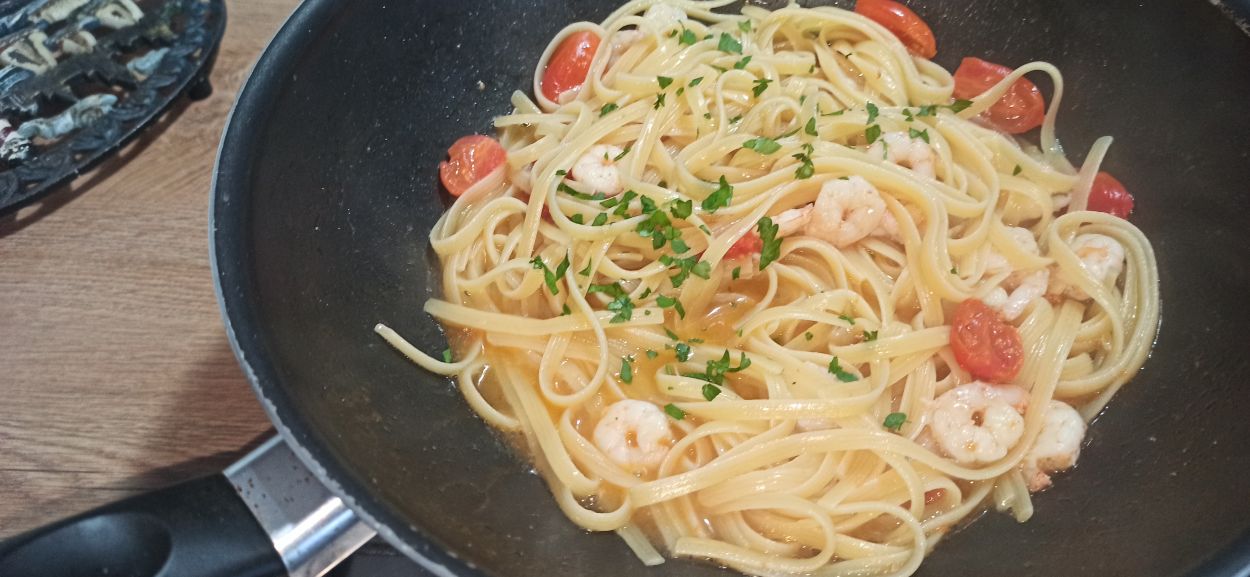 Regolate di sale e mescolate il tutto a fiamma vivace. Colate le linguine al dente, direttamente nella padella, aggiungete un poco d’acqua di cottura, un poco di prezzemolo tritato e spadellate a fiamma vivace.