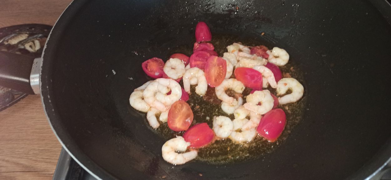 appena l’aglio sarà imbiondito, eliminatelo insieme ai gambi del prezzemolo. Aggiungete i pomodorini, fateli cuocere per qualche minuto, poi aggiungete i gamberetti.