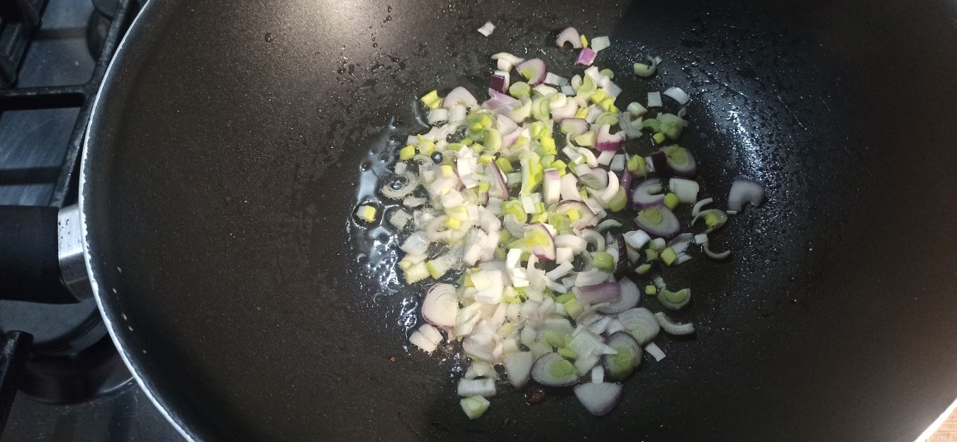 Nella stessa padella, senza aggiungere olio, fate rosolare i cipollotti di Tropea.