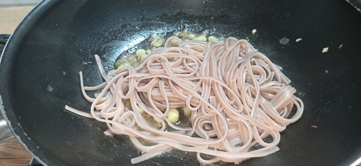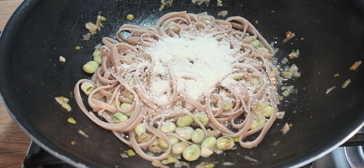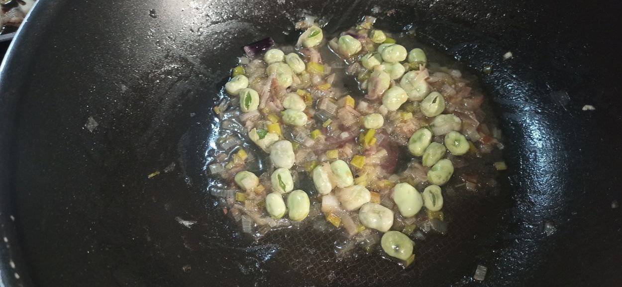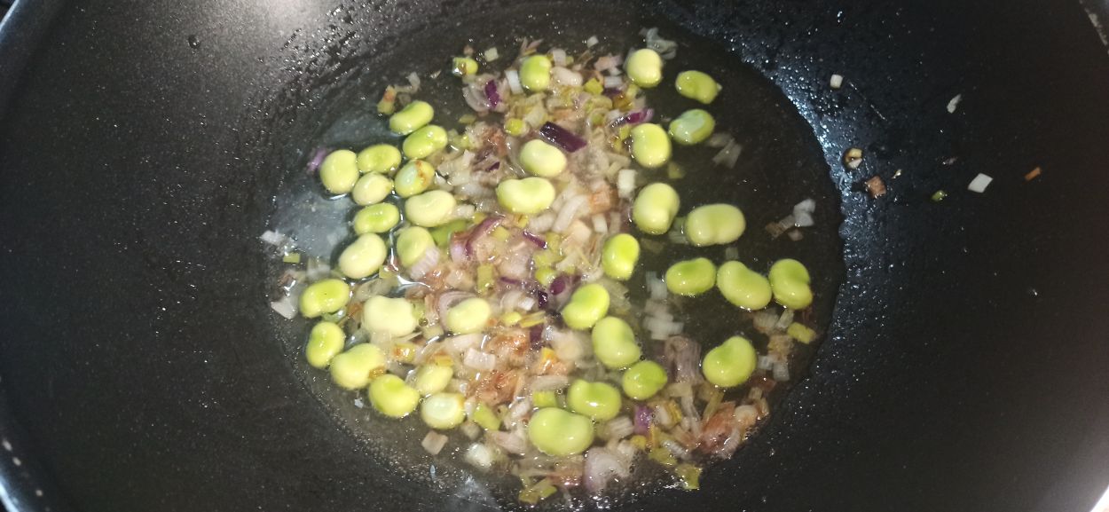 Aggiungete le fave, un paio di mestoli d’acqua e fate cuocere per dieci minuti.