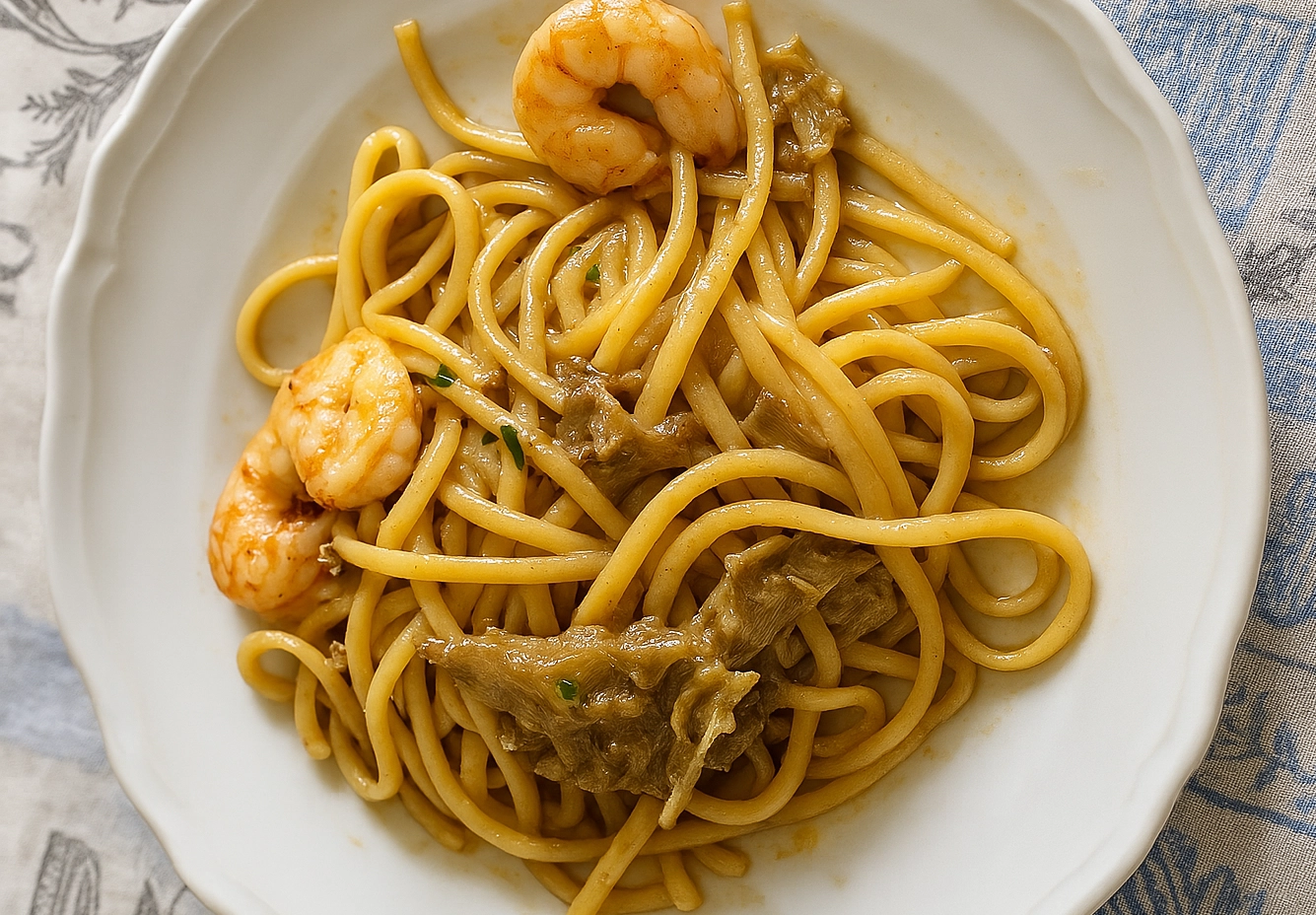 Cuoci le linguine in acqua salata, scolale al dente e trasferiscile nella padella con i carciofi. Aggiungi i gamberi e la bisque calda poco alla volta per mantecare bene la pasta e ottenere una consistenza cremosa. Togli dal fuoco, aggiungi una spolverata di prezzemolo tritato e, se vuoi, un filo d’olio a crudo.