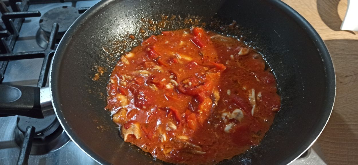 Fate cuocere per cinque minuti, girandoli spesso, in modo da ottenere una cottura uniforme. Aumentate la fiamma al massimo, eliminate i gambi di prezzemolo e lo spicchio d’aglio, e sfumate con il vino bianco. Fate evaporare l’alcol, cuocete per altri due minuti. Togliete i pesci dalla padella, e aggiungete i pomodori pelati, leggermente schiacciati. Fate cuocere per dieci minuti. Nel frattempo che i pomodori cuociono, eliminate la testa e le lische dai pesci, e aggiungete la polpa, nella padella.