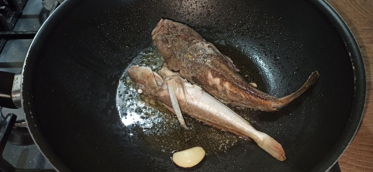 Per preparare le linguine nere al profumo di mare, iniziate a pulire e lavare bene i pesci. In una capiente padella, mettete un paio di giri abbondanti di olio evo, aggiungete lo spicchio d’aglio, i gambi del prezzemolo, il coccio e la lucerna.