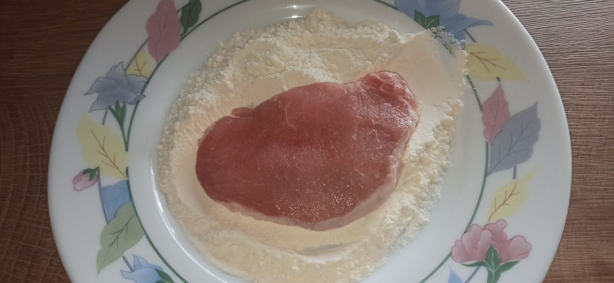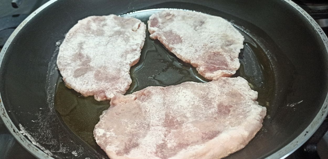 Per preparare le lonzine della bella donna, iniziate a mettere la farina in un piatto, mescolatela con un pizzico di sale e pepe. Passate le fettine di lonza nella farina.