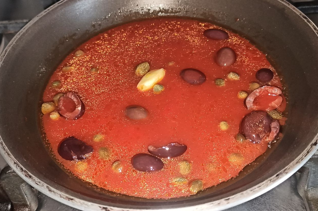 Appena saranno rosolate, mettetele in un piatto. Nella stessa padella, fate imbiondire lo spicchio d’aglio, se occorre aggiungete altro olio evo. Aggiungete il passato di pomodoro, le olive di Gaeta denocciolate ed i capperi.