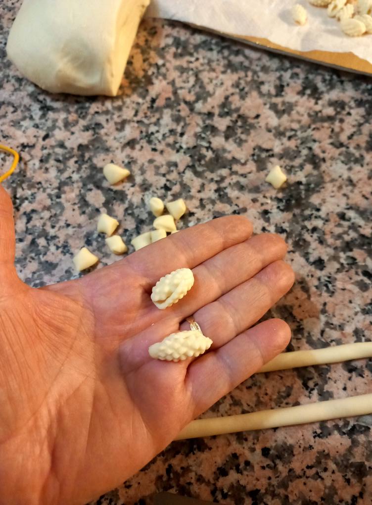 Riprendere il panetto di pasta e prelevare una parte dell’impasto. Arrotolarlo sul piano di lavoro formando un cilindro sottile, simile a quello degli gnocchi di patate, ma molto più fine. Tagliare quindi tanti pezzettini di circa 1 cm di lunghezza, avendo cura di coprire la pasta rimanente per evitare che si secchi.