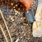 Infarinare l’apposita tavoletta per rigare gli gnocchetti oppure, in mancanza di essa, utilizzare la parte interna della grattugia. Premere ogni pezzetto di impasto contro la superficie rigata aiutandosi con il pollice.