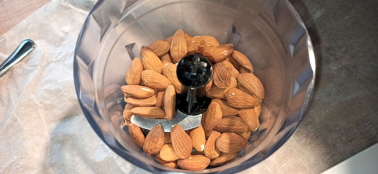Per preparare i mandorlotti mela e amarena, iniziate a mettere le mandorle nel mixer.