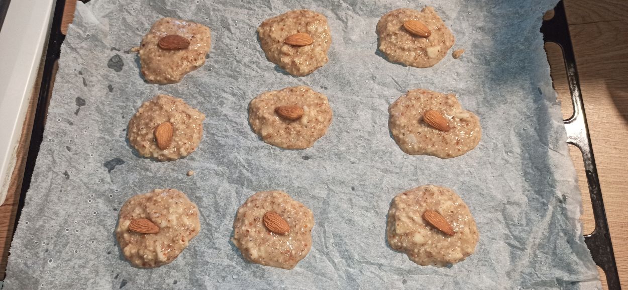 Con l’aiuto di due cucchiai, prelevate piccole quantità e disponetele su una teglia foderata da carta forno, completate con una mandorla.