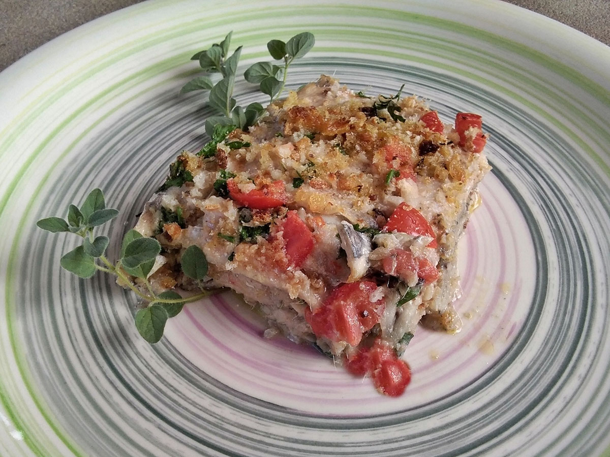 Irrorate con un bel giro di olio extravergine di oliva. Adesso create un altro strato. Ricominciate dalle alici, poi aglio e prezzemolo e ancora pane raffermo. Completate aggiustando di sale e pepe e bagnando ancora con l’olio. Se volete potete aggiungere anche qualche pomodorino tagliato a pezzetti. Fate cuocere in forno a 180 gradi per 15 minuti. La parte superiore della portata deve risultare ben dorata. Le vostre Mattonella di alici alla pugliese sono pronte. Da servire ben calde, a tavola faranno un figurone.