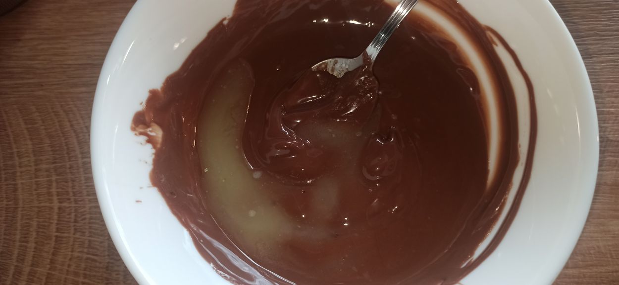 Spezzettate il cioccolato in una ciotolina, fondetelo nel microonde oppure a bagnomaria. Con l’aiuto di un pennellino, rivestite le pareti di uno stampo in silicone, mettete in frigo a riposare per circa un’ora. Nel frattempo, fondete anche il burro, aggiungetelo al cioccolato fuso,