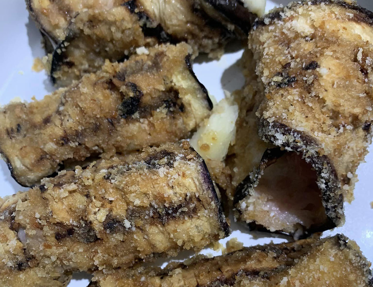 Prendete le fette di melanzane cotte e su ciascuna disponete una fetta di prosciutto cotto e una di scamorza. Chiudete ogni fetta di melanzana a libro e passatela nel pane grattugiato da entrambi i lati. Disponete le melanzane ripiene sulla placca del forno, aggiungete un filo d’olio extravergine d’oliva e un pizzico di sale, quindi infornate nuovamente a 180°C per altri 15 minuti. Dopo questo tempo, le melanzane saranno dorate e il formaggio sarà filante. Servite le melanzane al forno con prosciutto cotto calde o a temperatura ambiente, a seconda delle vostre preferenze.