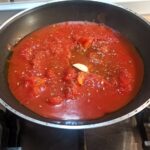 Mano a mano che si cuociono, mettetele da parte in un piatto. Nella stessa padella, mettete un giro d’olio evo, lo spicchio d’aglio, i pomodori pelati schiacciati, l’origano e fate cuocere a fiamma bassa per dieci minuti. A fine cottura, regolate di sale