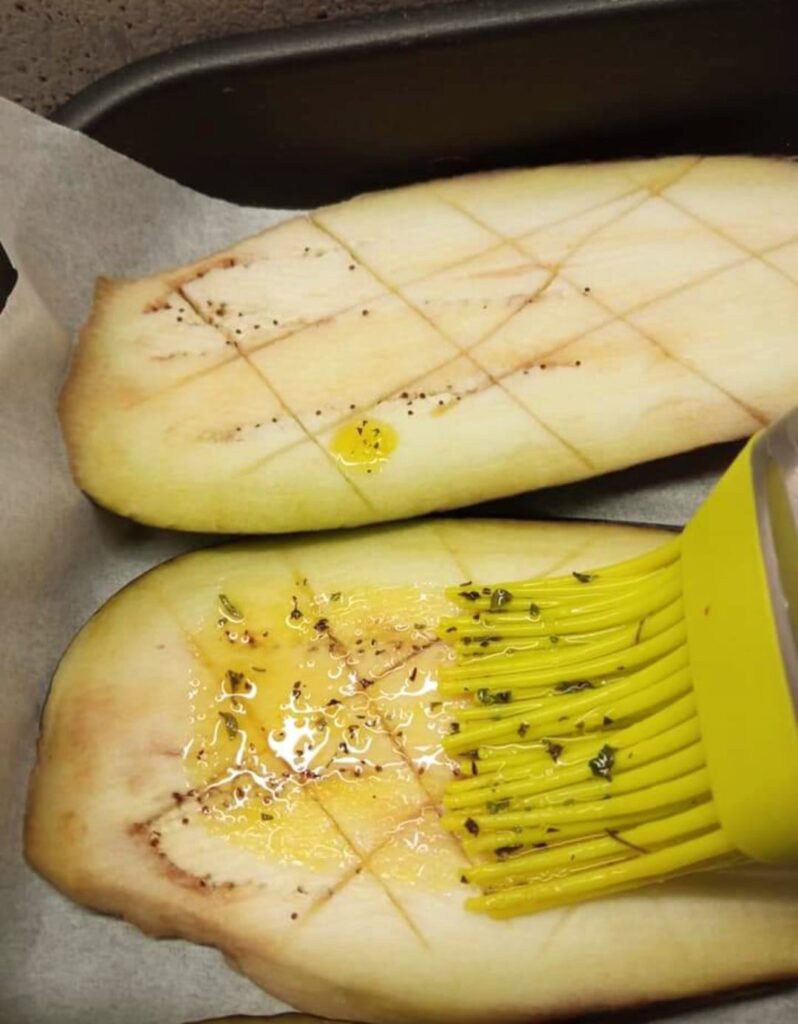 Mettiamo l’ olio in una piccola ciotola, insaporiamo con origano e sale. Tagliamo le melanzane per lunghezza con uno spessore non troppo sottile per poi adagiarle in una teglia foderata di carta forno e fate dei piccoli taglietti sopra ogni fetta. Questa metodica permetterà di insaporire di più la melanzana, ora spennellate con l’ olio aromatizzato con l’origano e il sale. Mettere in forno a 200 per 15/ 20 minuti.