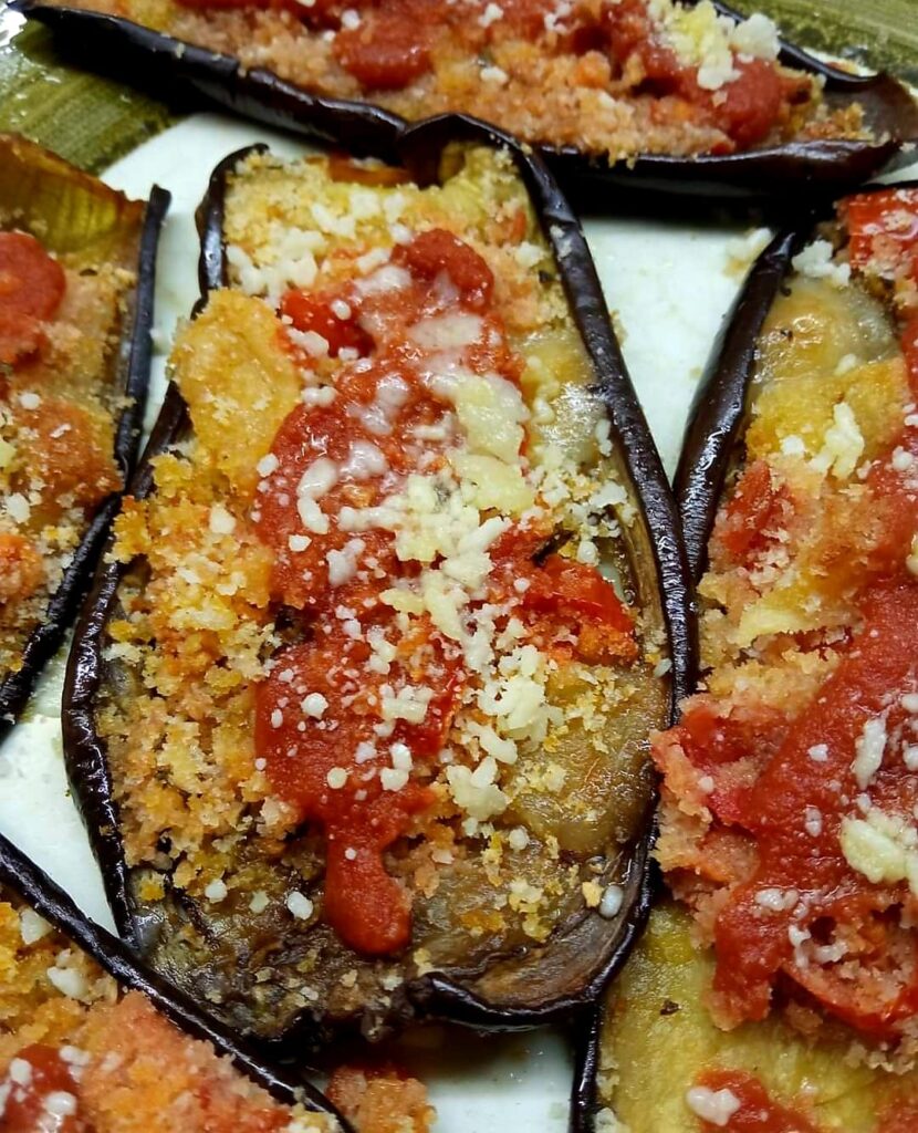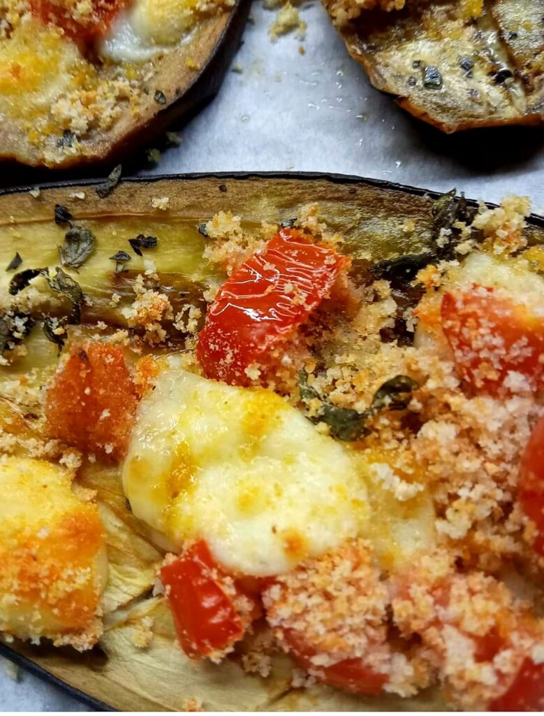 Nel frattempo tagliate i pomodori e il formaggio a cubetti, uniteli tra di loro aggiungendo anche il pangrattato, salate leggermente. Trascorso il tempo tirare fuori le melanzane e ad ogni fetta metteteci un paio di cucchiai del composto, se vedete che il tutto è troppo asciutto aggiungete sopra un filino di olio poi di nuovo al forno per 5/6 minuti. Le nostre melanzane sfiziose sono pronte per essere servite e gustate, buonissime sia calde che fredde. Buon Appetito