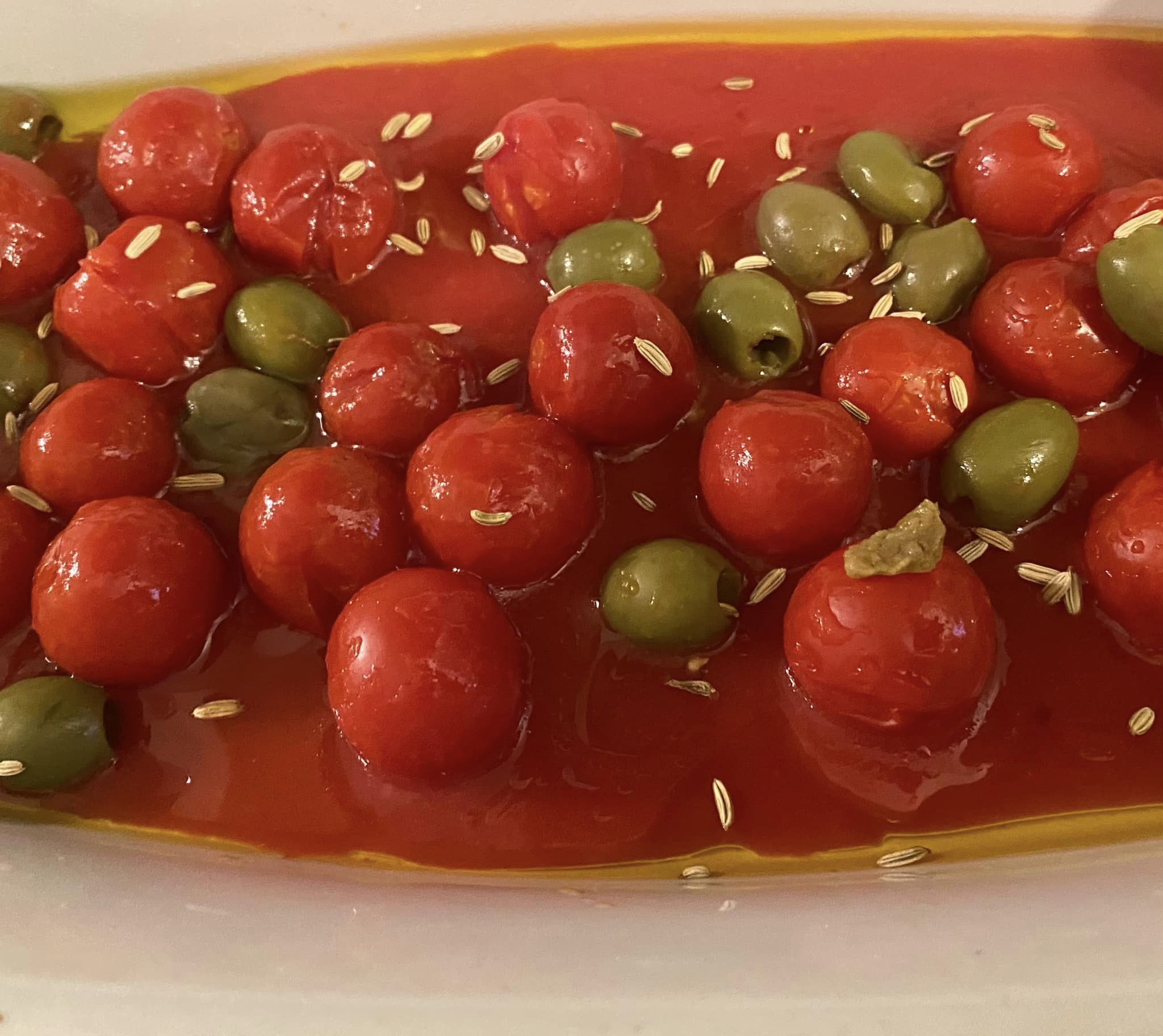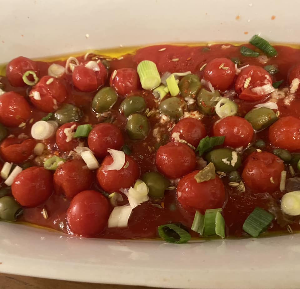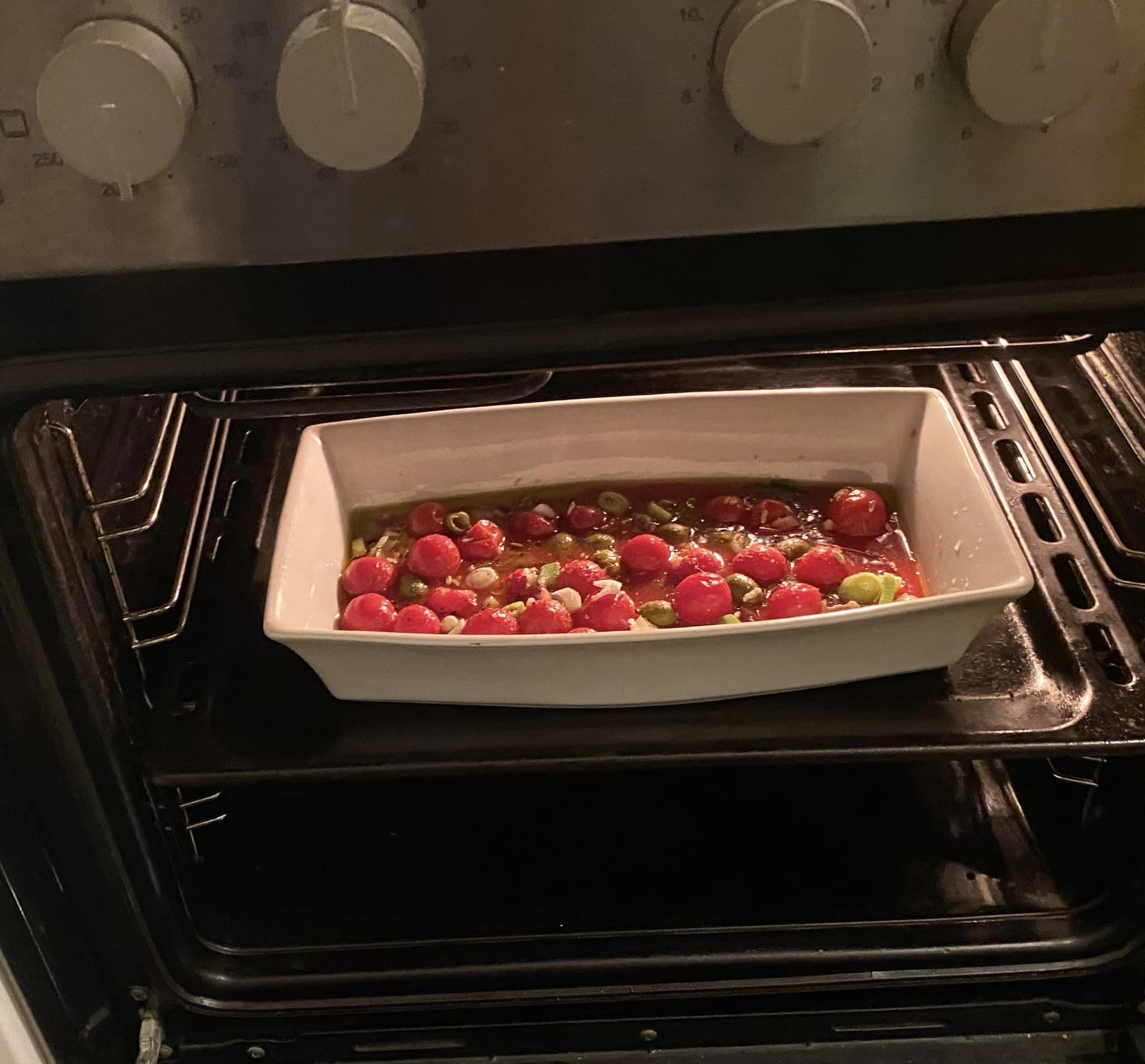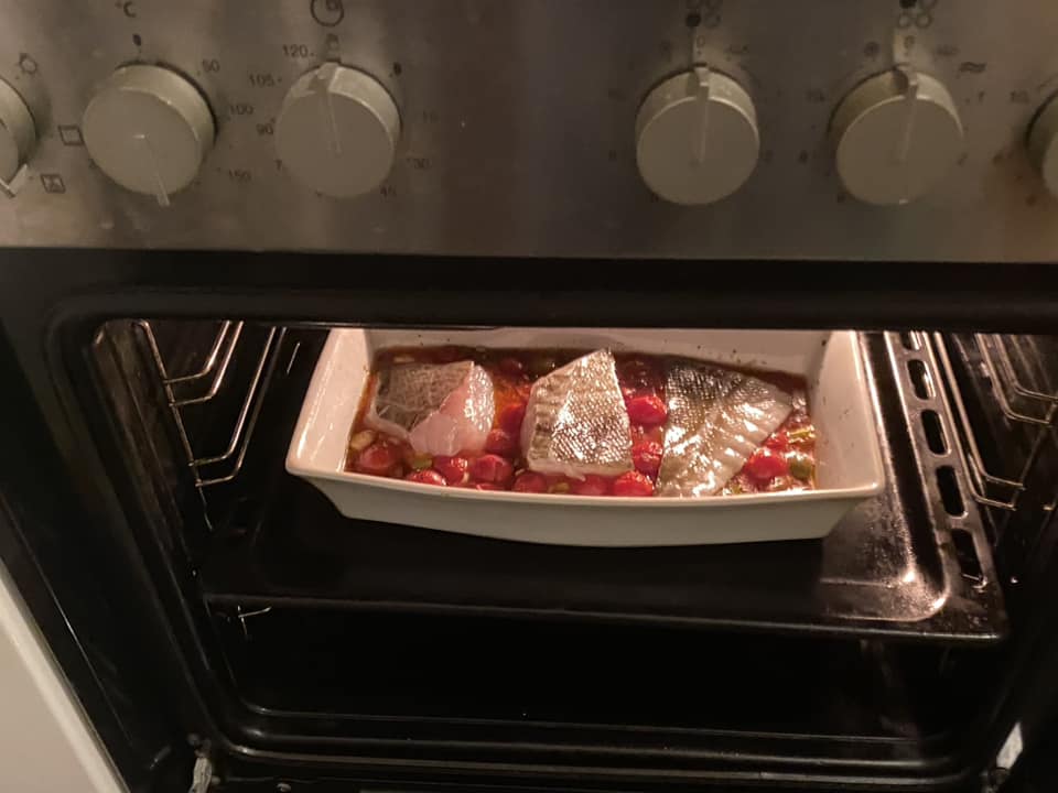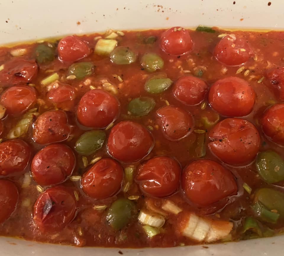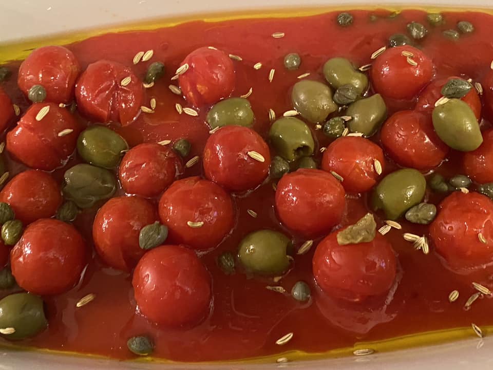 Abbiamo preparato gli ingredienti ed andiamo a procedere: Riscaldiamo il forno a 180 gradi. In una teglia da forno versiamo due cucchiai di olio, ed inseriamo i pomodorini, aggiungiamo le olive, spolveriamo con i semi di finocchio e i capperi. Le due acciughine le spezzettiamo per poi aggiungerle, tritiamo l’aglio e lo aggiungiamo. Spolveriamo con le scaglie di peperoncino e la cipollina tagliata a rondelline. Adesso sfumiamo con il vino per poi infornare in forno preriscaldato a 180 gradi per 20 minuti circa.