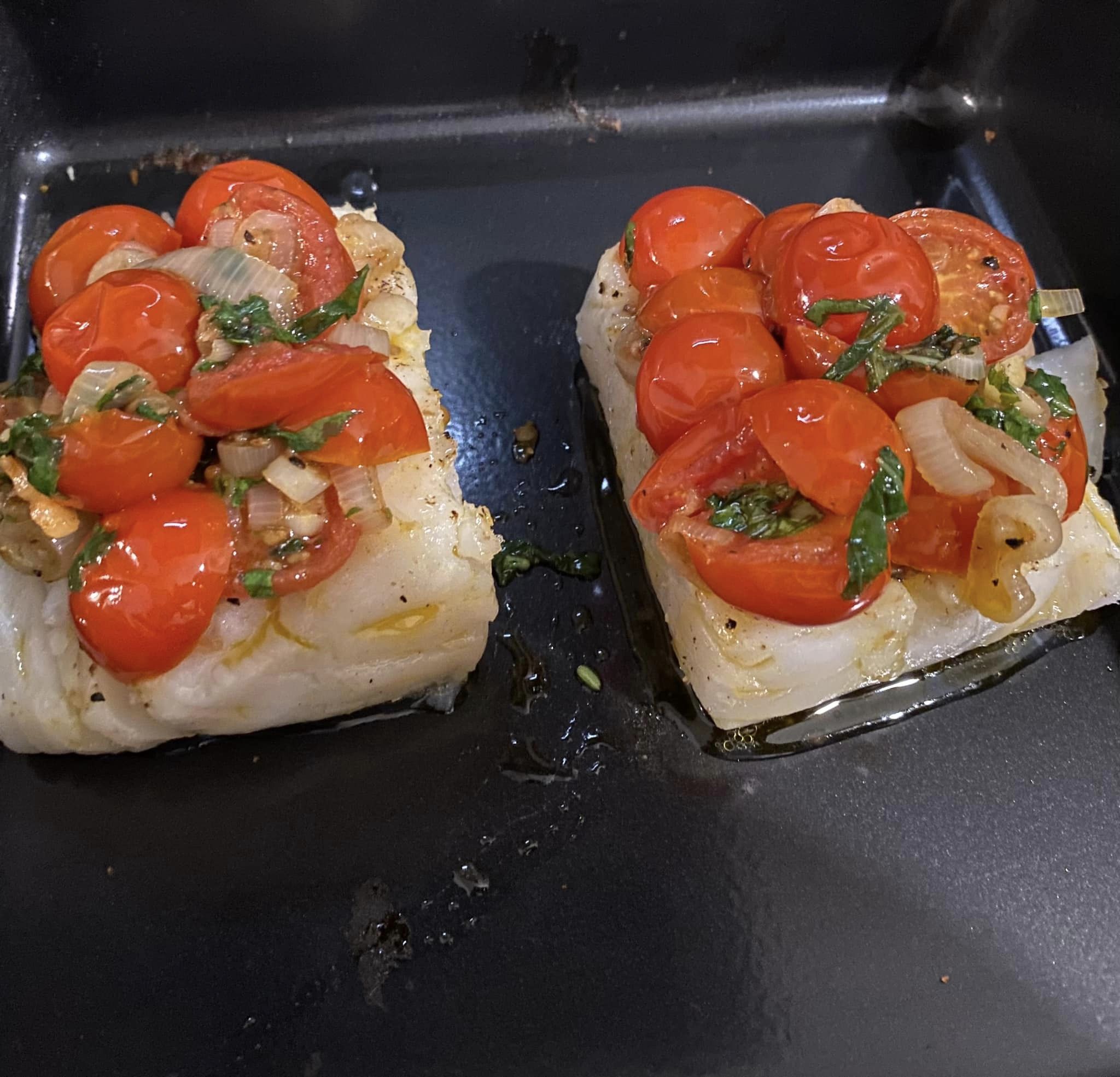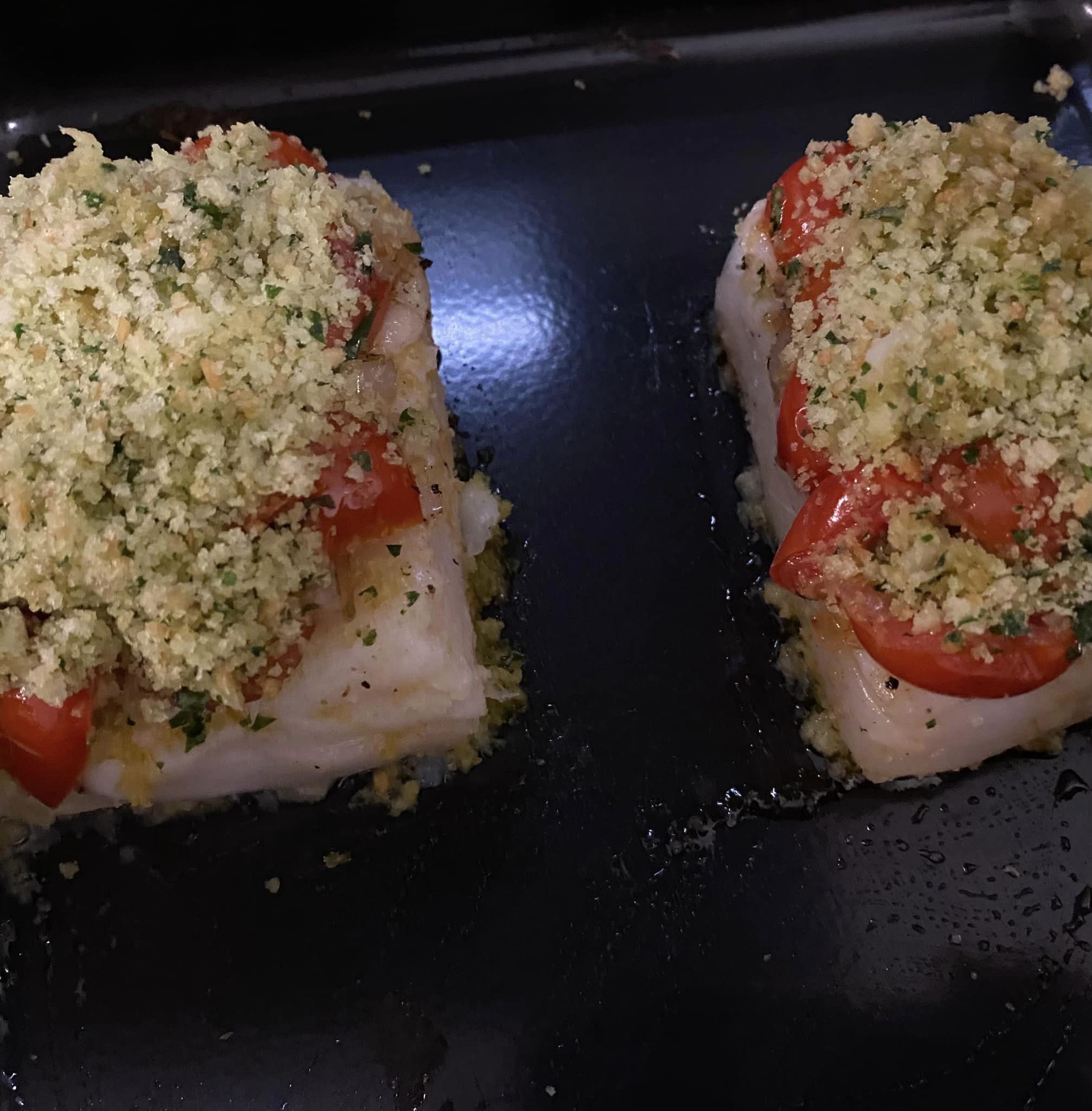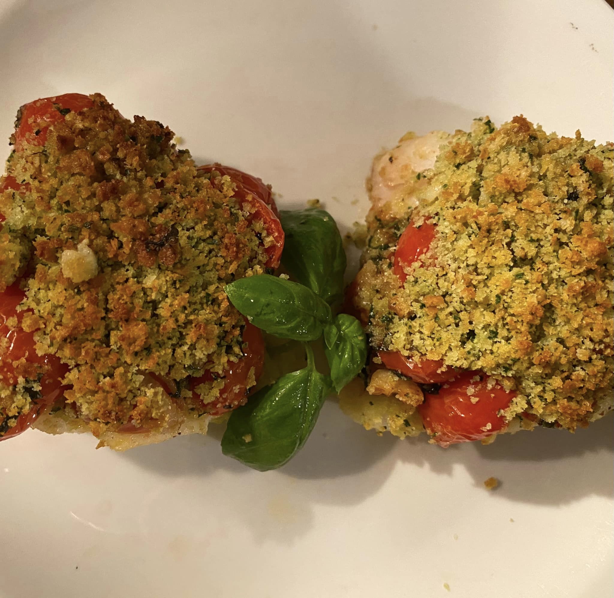 Frulliamo il tutto fino ad ottenere un composto (come nella foto). Abbiamo già ritirato i filetti che adagiamo in una teglia, adagiamo sopra i filetti la salsa, pomodorini, basilico, poi spolveriamo con la mistura frullata ed inforniamo in forno preriscaldato a 170 gradi per 8 minuti circa. Impiattiamo e guarniamo con foglie di basilico