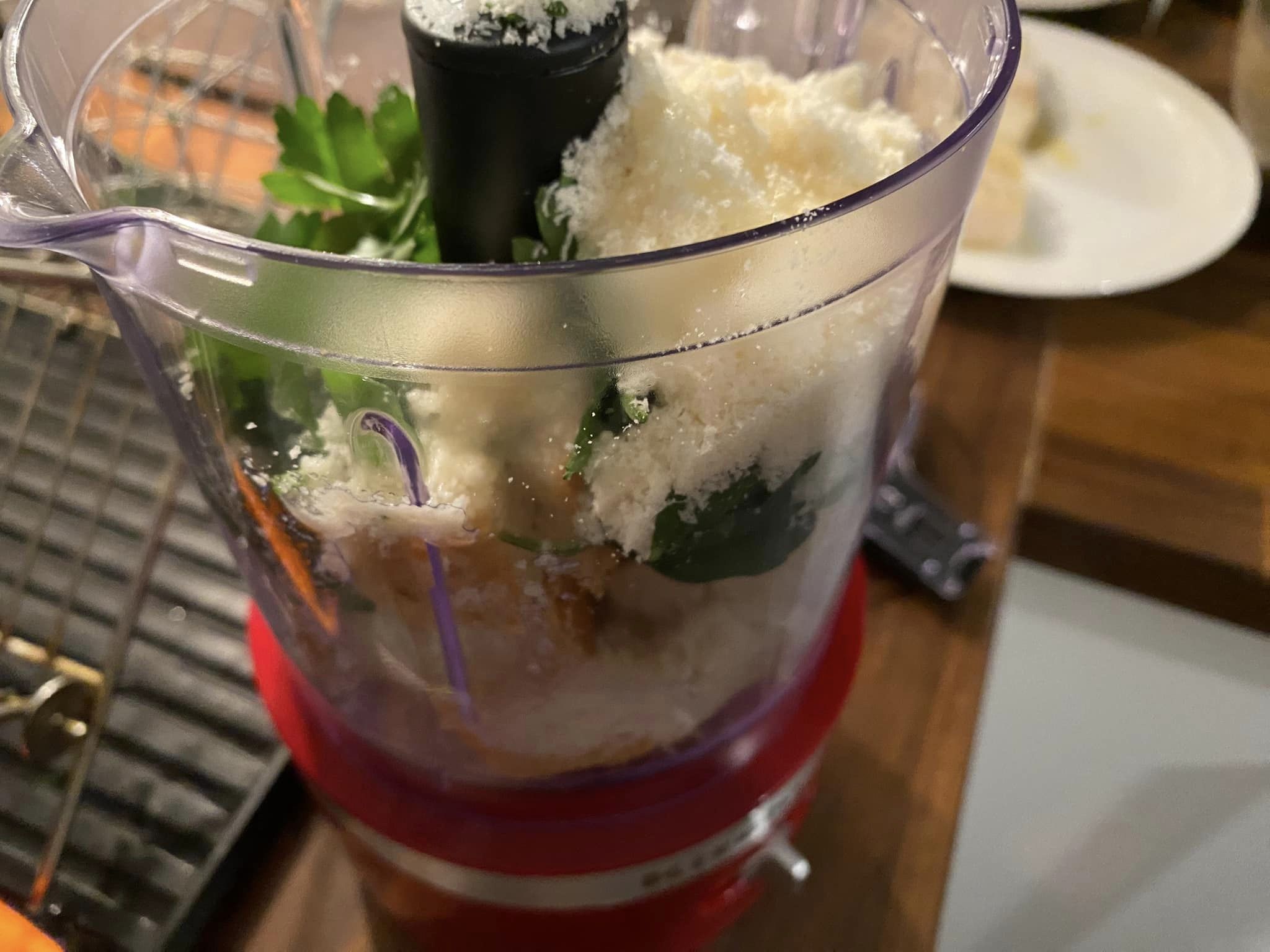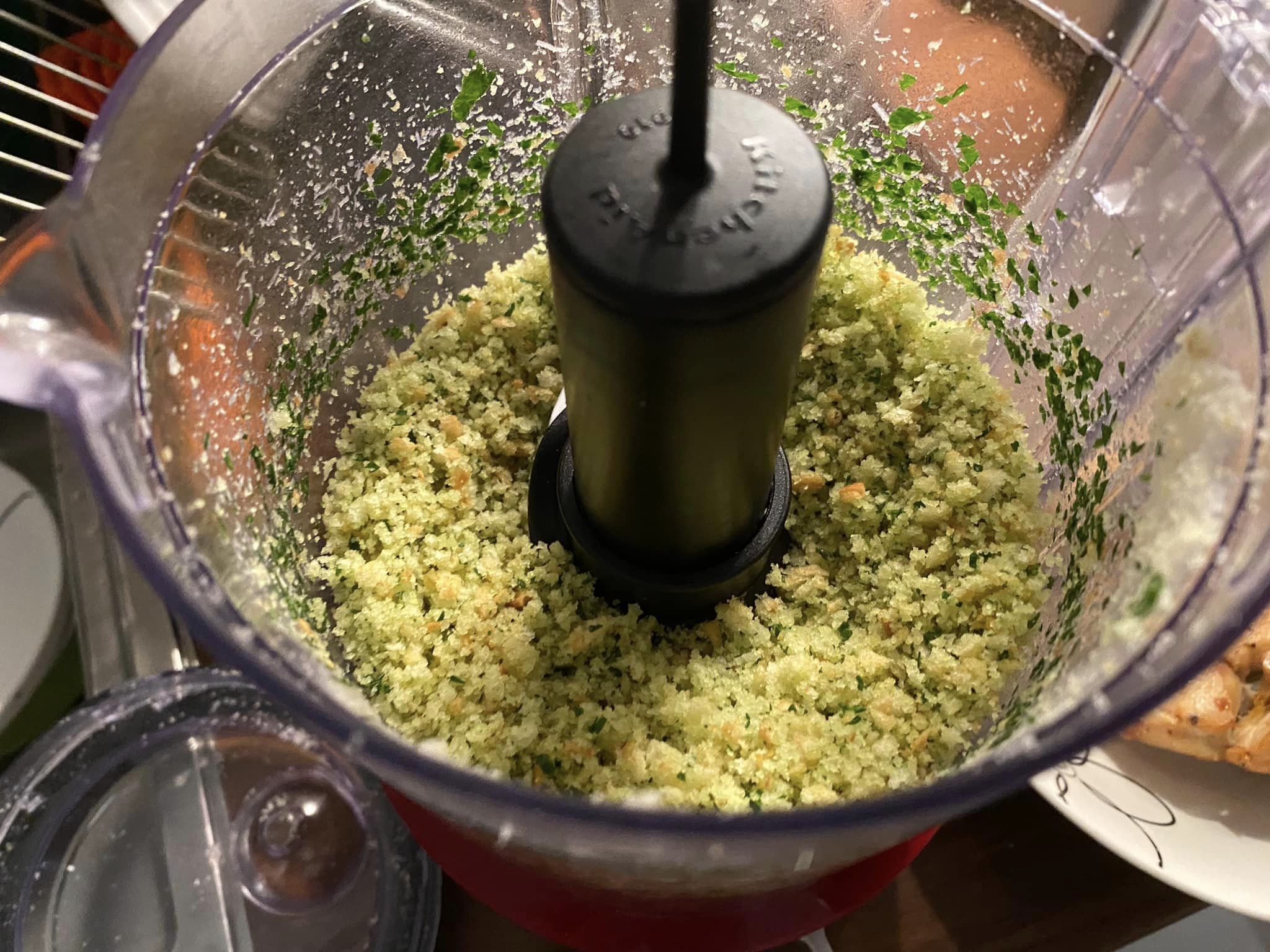 Aggiungiamo generosamente le foglie di basilico, sale e pepe quanto basta, saltiamo e cuociamo per pochi minuti, con coperchio, sempre a fiamma media. Ritiriamo e lasciamo riposare in una bola. Inseriamo nel fondo di cottura il merluzzo, che dovrà rosolare solo due minuti. Intanto in un frullatore abbiamo inserito il pane tagliato a pezzettini, due cucchiai di prezzemolo precedentemente tagliato grossolanamente, 40 gr di parmigiano grattugiato e un filo d’olio