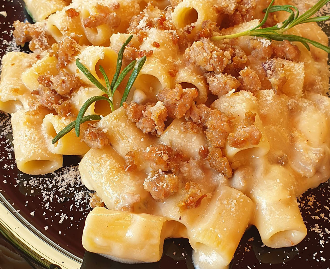 Mezze maniche con crema di patate e salsiccia croccante, un primo piatto cremoso, saporito e perfetto per tutta la famiglia, dai sapori rustici ma delicati. La dolcezza delle patate si unisce al gusto intenso della salsiccia e al profumo del pecorino per una combinazione irresistibile.