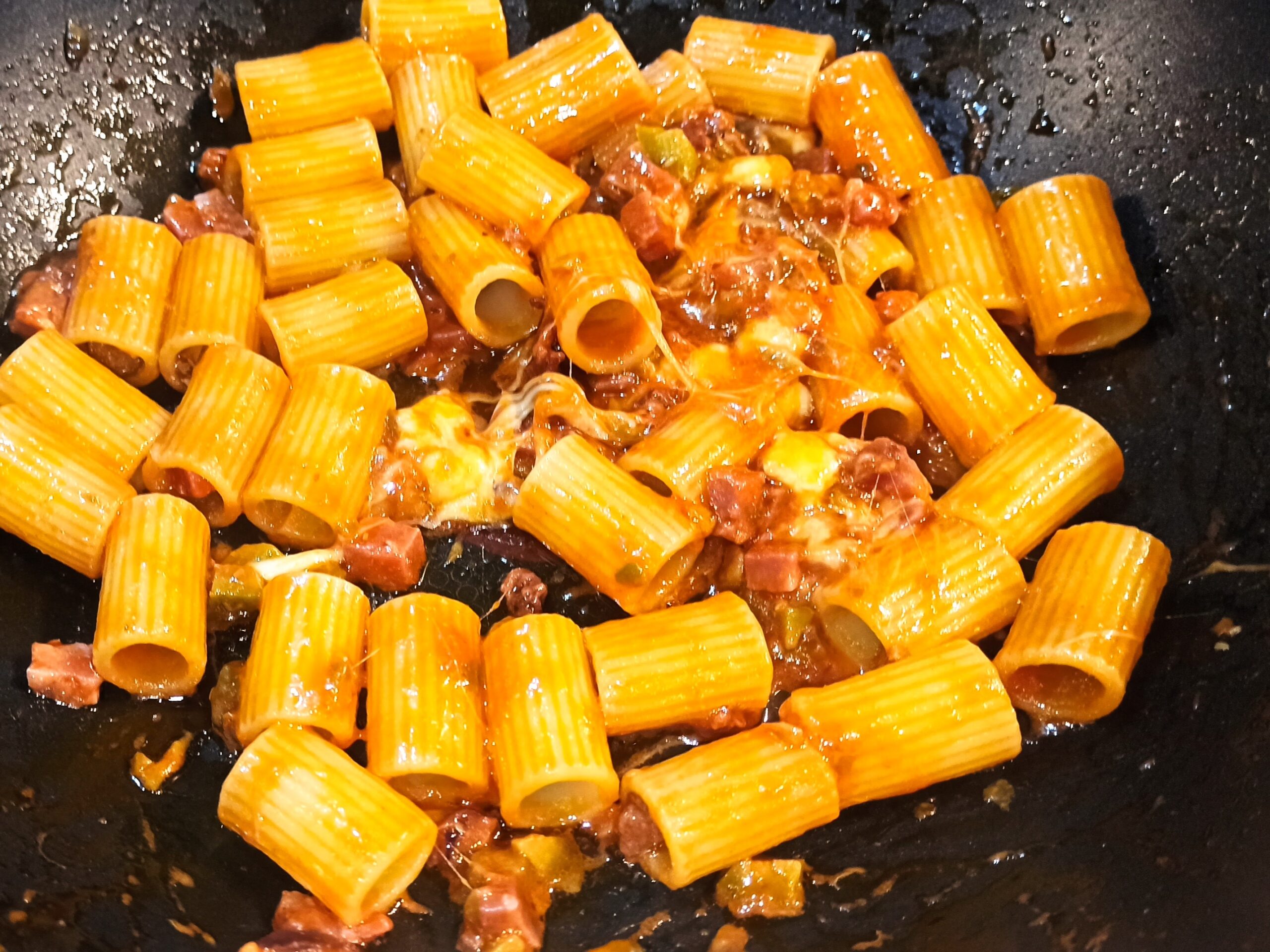 Colate la pasta al dente direttamente nella padella, mescolate, spegnete la fiamma. Tagliate a pezzetti sia il salame che la scamorza, e aggiungeteli nella padella. Amalgamate il tutto,