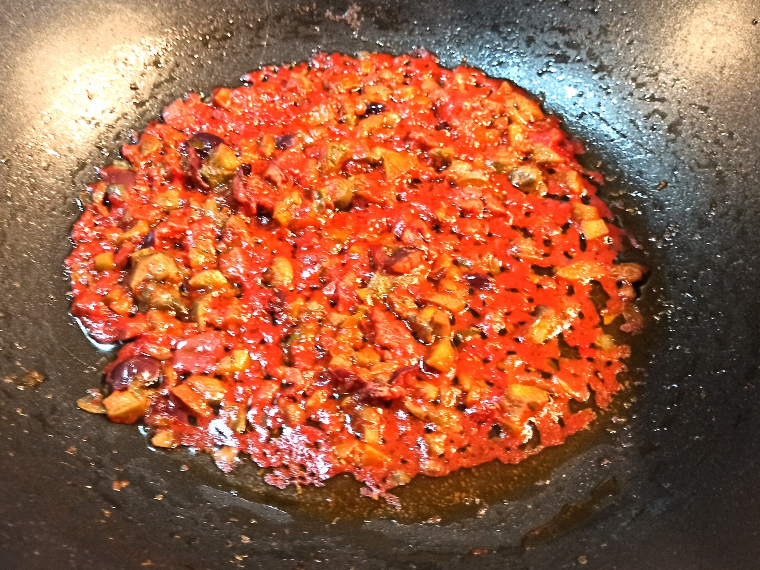 A questo punto aggiungete il concentrato di pomodori e l’estratto di peperoncini piccanti. Mescolate, aggiungete un poco d’acqua di cottura, e se occorre regolate di sale.
