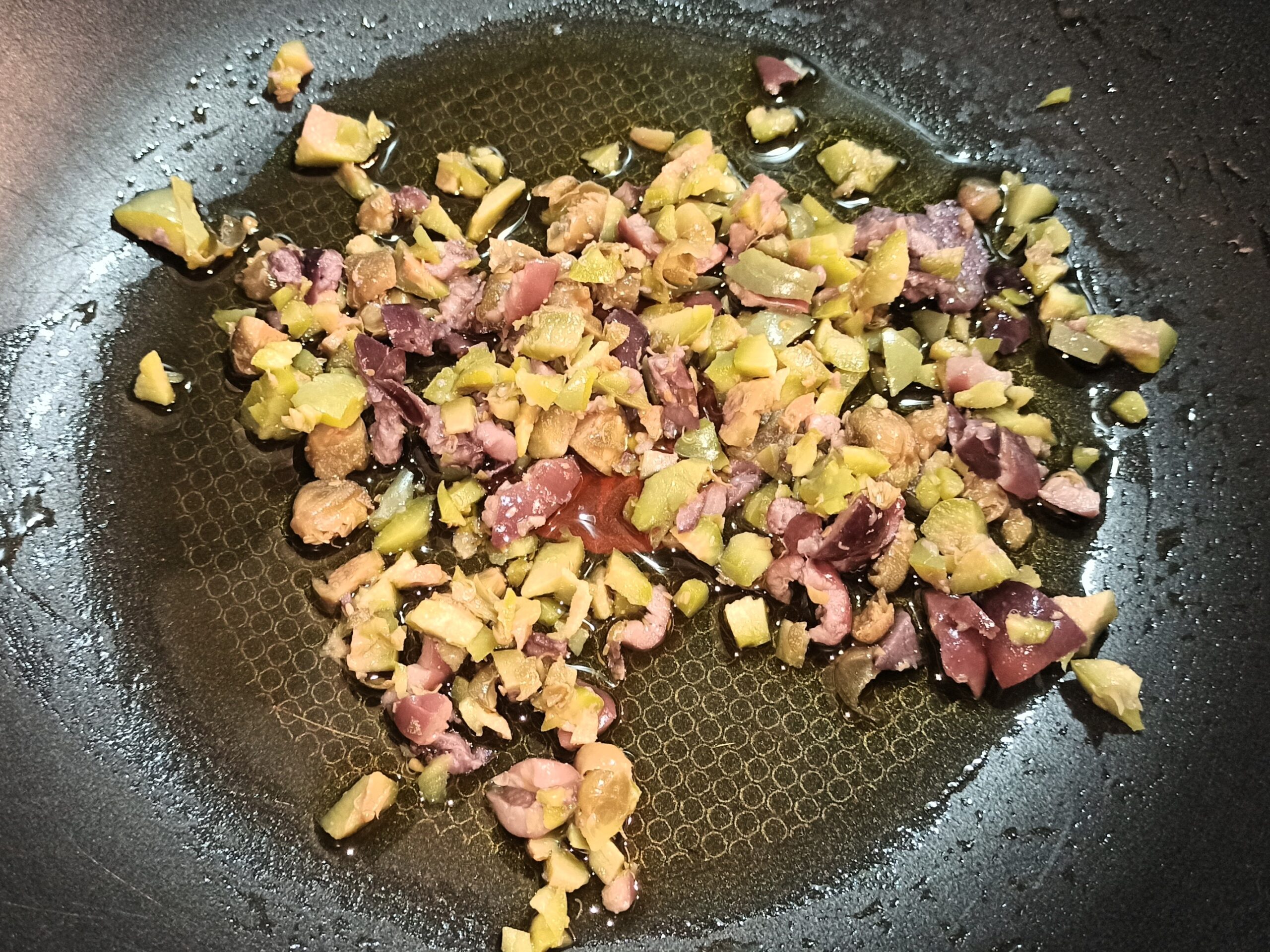 Aggiungete le olive ed i capperi precedentemente tritati, e fate cuocere per un paio di minuti a fiamma dolce.