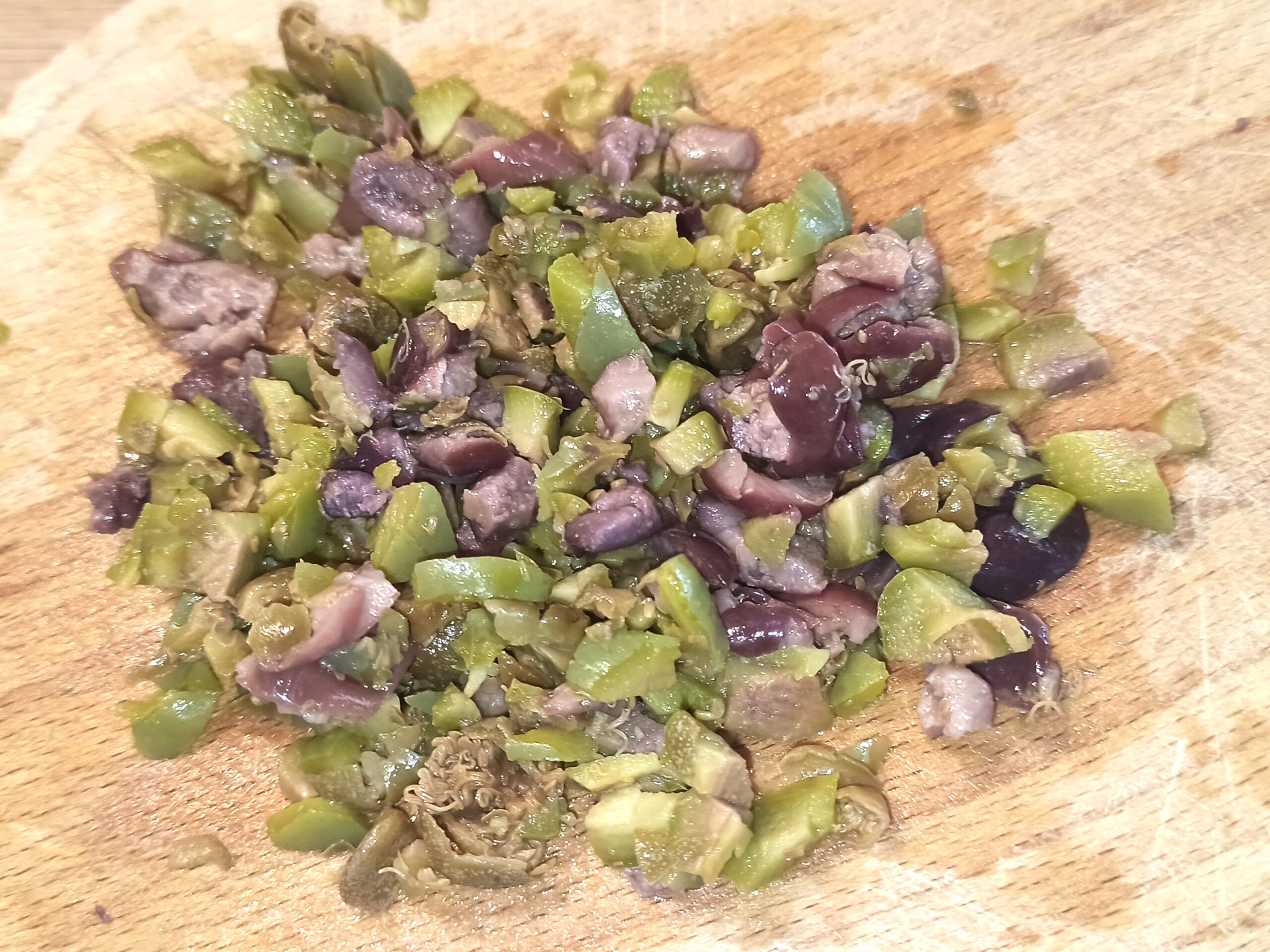 Per preparare le mezzemaniche infuocate, iniziate a denocciolare le olive, e tritatele insieme ai capperi.