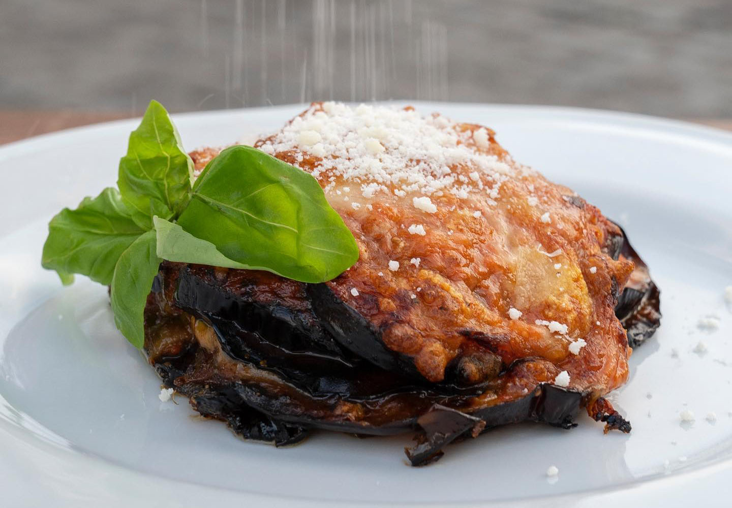 MILLEFOGLIE DI MELANZANE PESCE SPADA E POMODORINI CONFIT