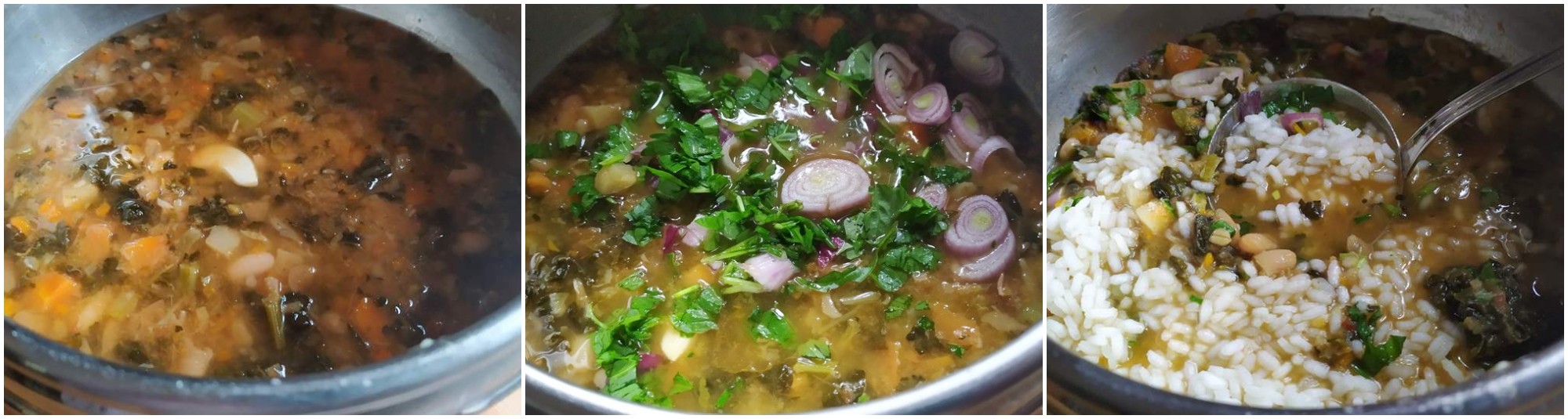 Mescolate ed aggiungete acqua fino a ricoprire tutte le verdure; salate, coprite con un coperchio e lasciate cuocere a fuoco basso per circa un’ora: per renderlo più gustoso aggiungete, a metà cottura, le scorze di parmigiano in modo che si disfino.