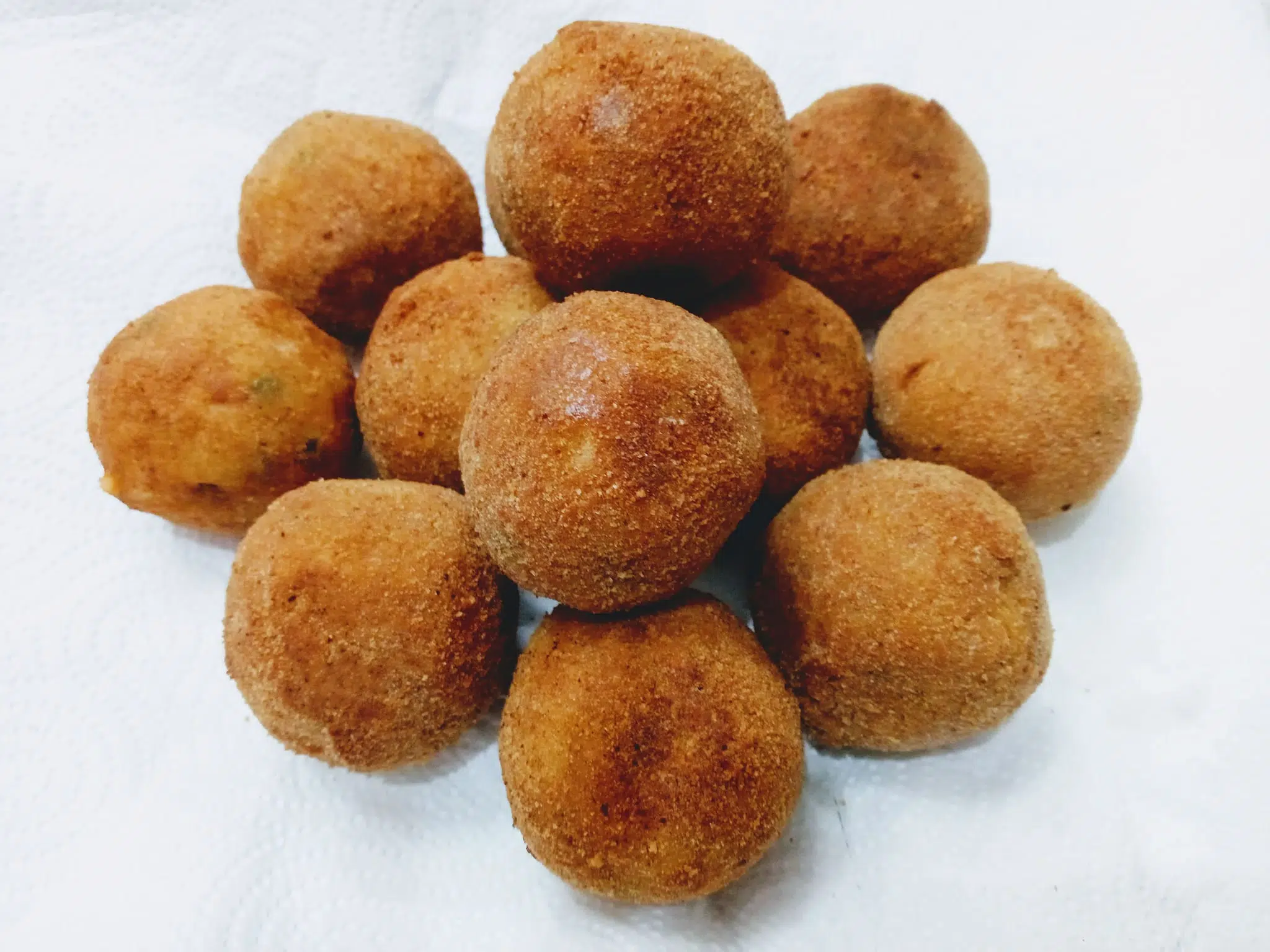 Richiudere il riso formando una pallina compatta. Procedere fino a esaurire gli ingredienti. Passare gli arancini prima nella farina, poi nelle uova sbattute e infine nel pangrattato, premendo leggermente per far aderire bene. Scaldare abbondante olio di semi di arachide in una pentola e portarlo a 170°C. Friggere pochi arancini alla volta fino a doratura uniforme. Scolarli su carta assorbente per eliminare l’olio in eccesso.