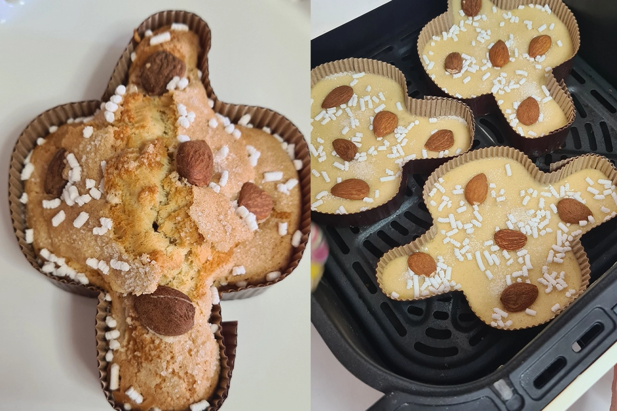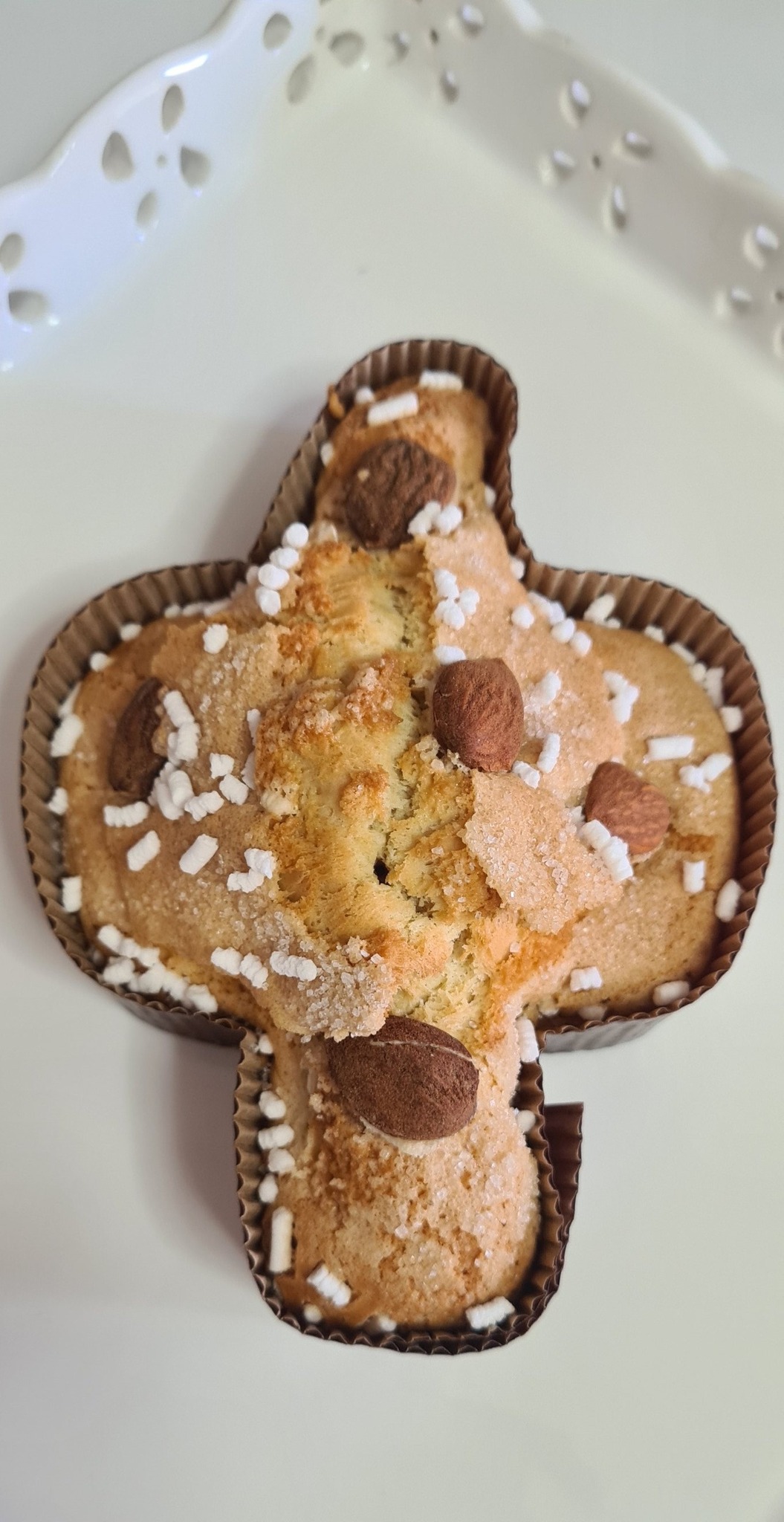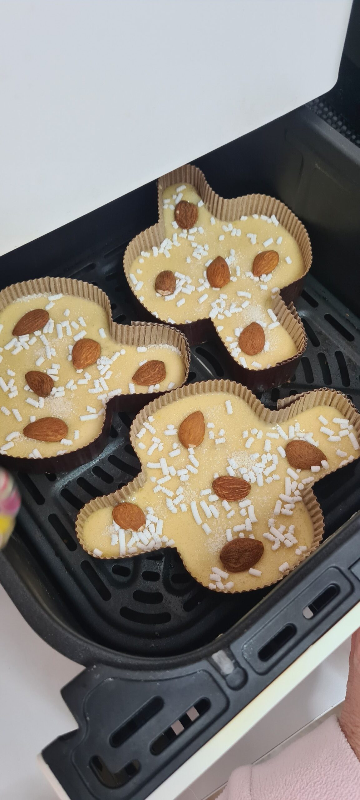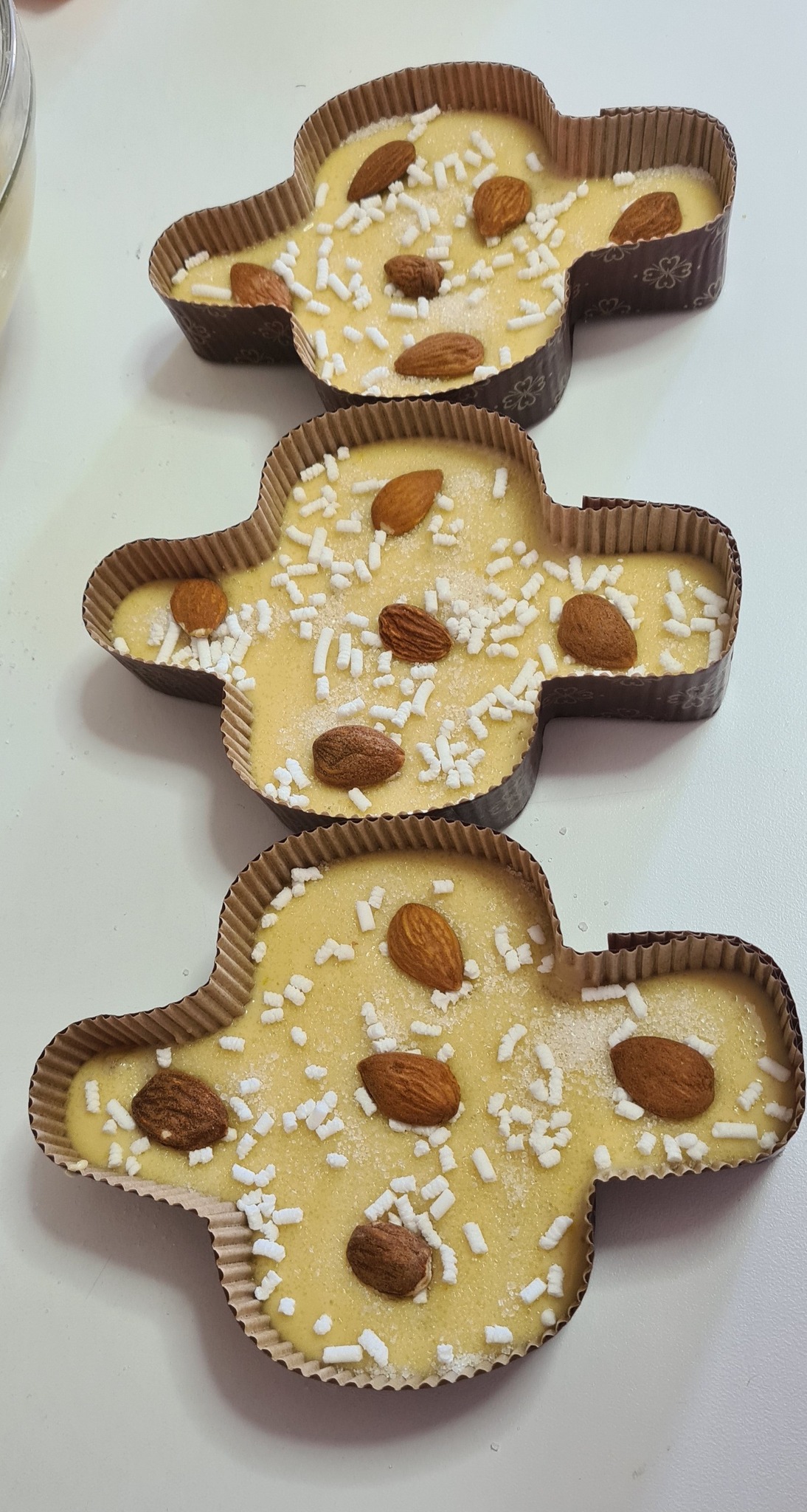 Sciogliete il lievito per dolci nel latte tiepido (usate un bicchierino da caffè) e incorporatelo all’impasto. Distribuite il composto nei pirottini di carta (potete trovare quelli a forma di colomba su Amazon o nei negozi di articoli per dolci). Riempiteli per circa 2/3. Decorate la superficie con una spolverata di zucchero semolato, qualche granello di zucchero e mandorle a piacere.