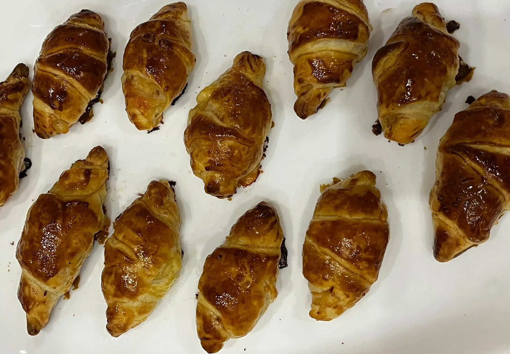 Adesso togliamo il foglio di carta e facciamo dei triangoli lunghi tutta la misura della pasta sfoglia. Con queste proporzioni dovrebbero uscire 8 cornettini o 6 medi. La grandezza però decidetela voi senza problemi. Arrotoliamo quindi dalla parte a due angoli fino alla fine. Una volta ottenuti i cornetti spennelliamo con del tuorlo d’uovo sbattuto.