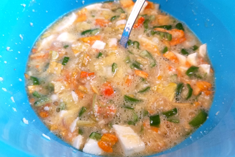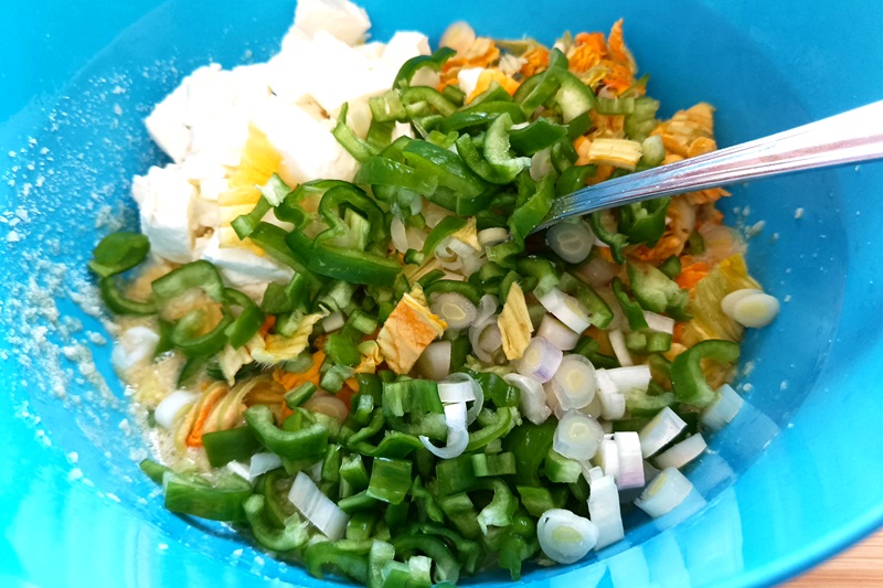 In una ciotola sbattete brevemente le uova, unite il parmigiano grattugiato e regolate di sale e pepe; unite i fiori di zucca a pezzi, la cipolla ed i friggitelli, la mozzarella sbriciolata, aggiungete la pasta ed amalgamate ben gli ingredienti.