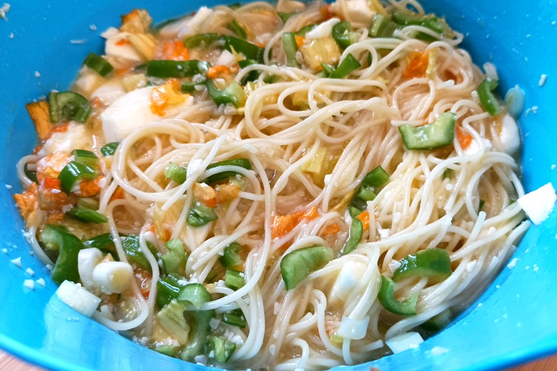 Lessate la pasta in abbondante acqua salata, scolatela al dente, conditela con un filo d’olio d’oliva, per non farla attaccare, e lasciatela raffreddare. Pulite i fiori di zucca eliminando gambi e pistilli, e lavateli delicatamente e tenetene qualcuno da parte; mondate anche i friggitelli e la cipolla, e tagliate tutto a fettine.