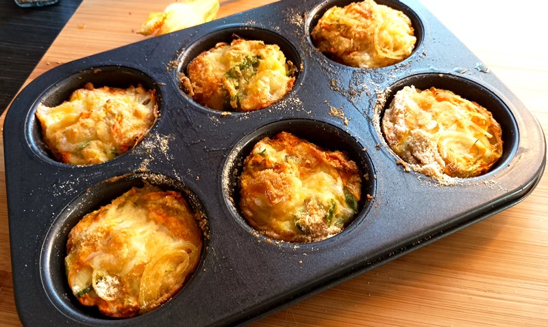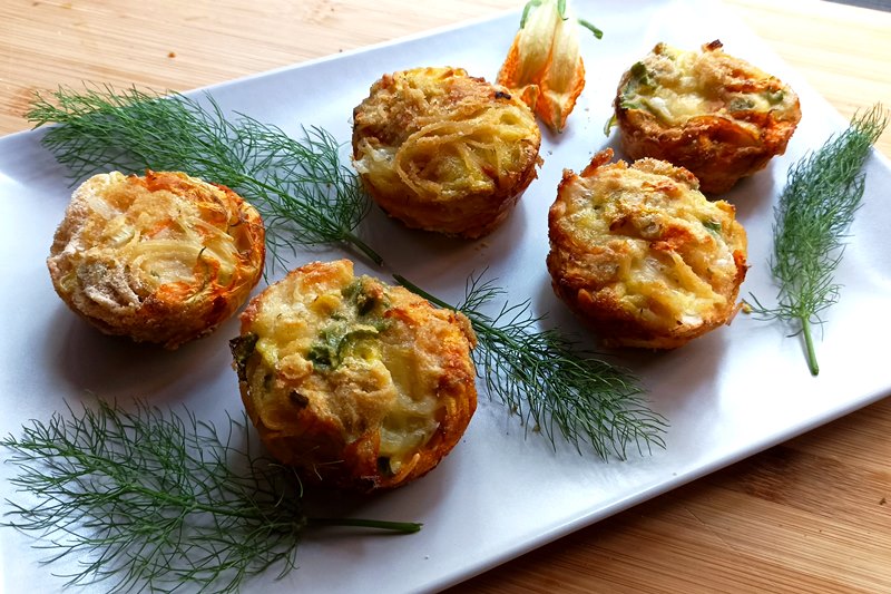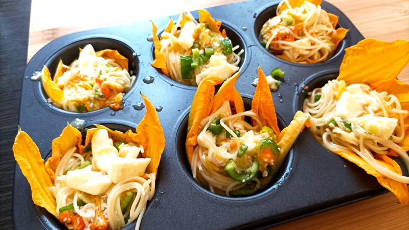 Muffin di frittatine di pasta con fiori di zucca e verdure