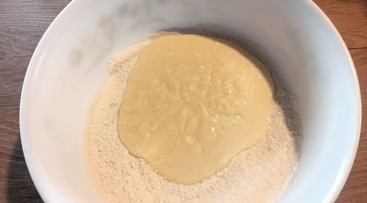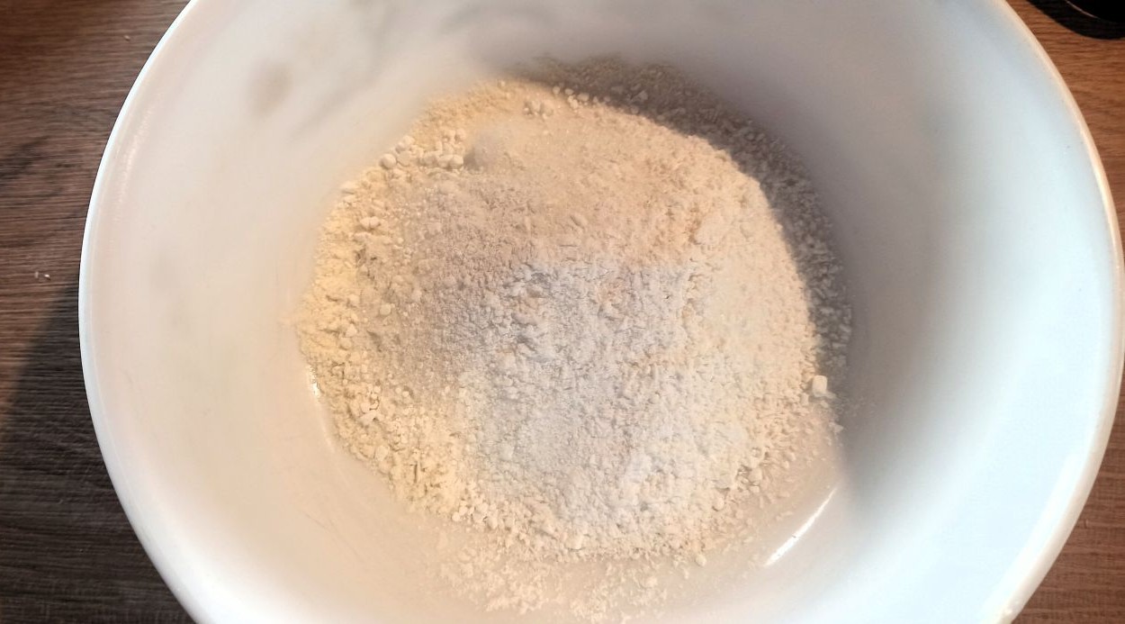 In un’altra ciotolina, setacciate la farina, aggiungete il lievito, lo zucchero e il pizzico di sale.