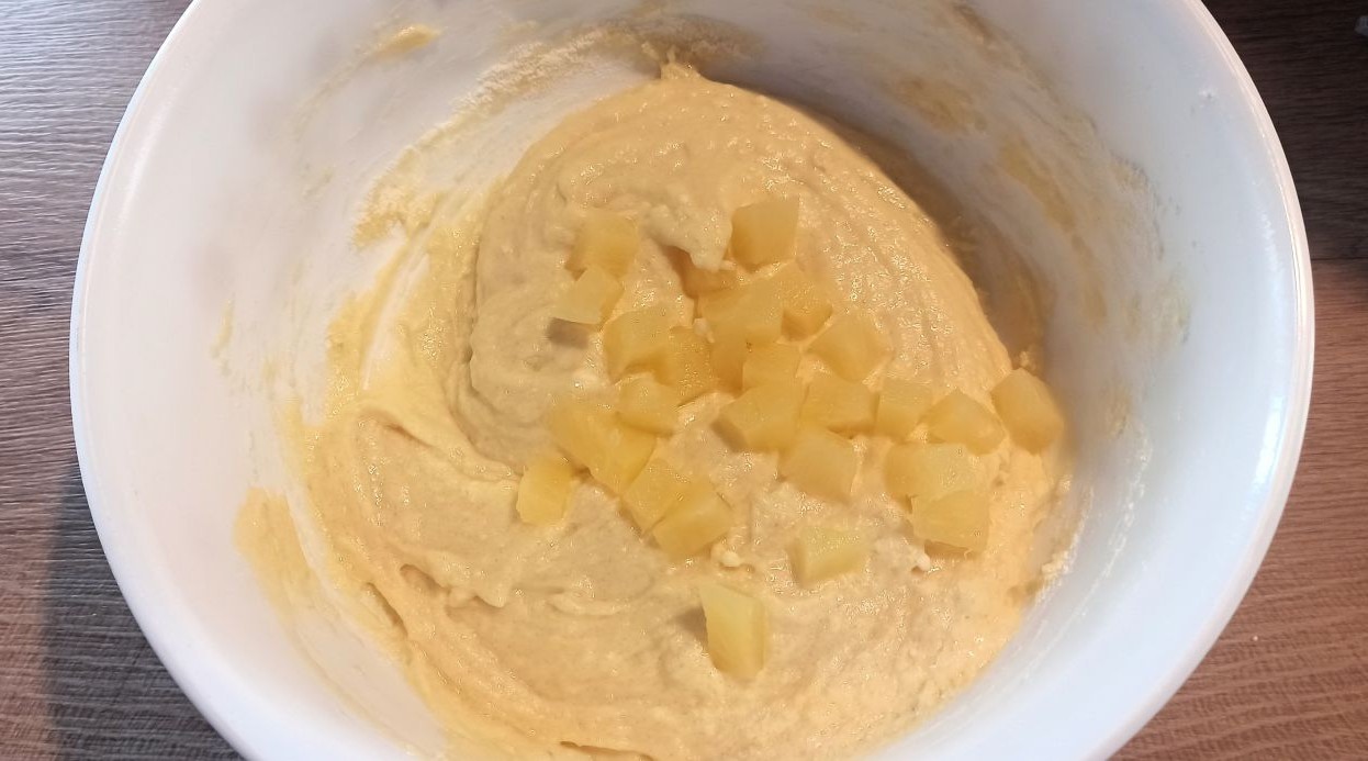 Per preparare i muffin ricotta e ananas, iniziate a mescolare in una ciotolina, la ricotta, le uova, l’olio, il latte e l’aroma al limone.