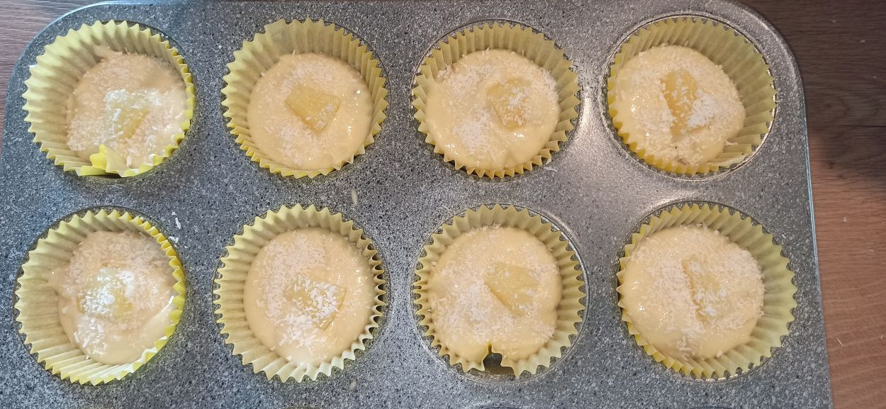 Versate il composto nei pirottini, riempiendoli per 3/4. Completate con i pezzetti di ananas, e la granella di zucchero.