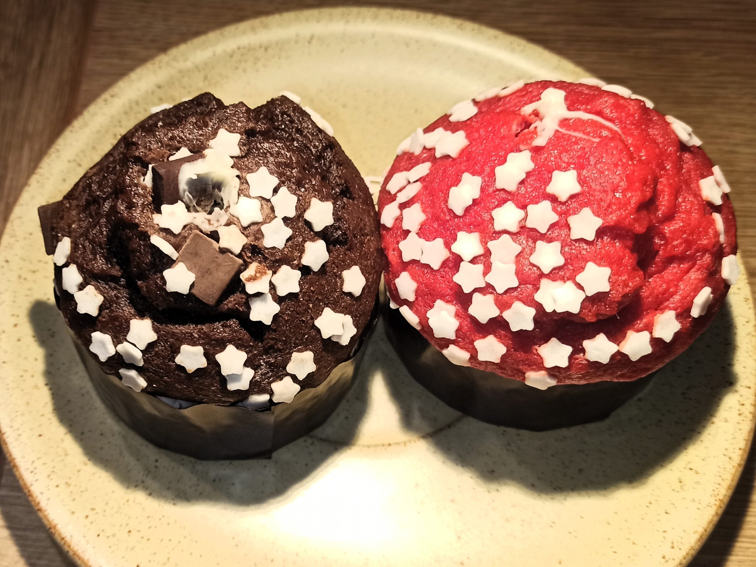 Dividete l’impasto in due, ad uno aggiungete il colorante alimentare, e nell’altro il cacao in polvere. Sistemate i pirottini, nell’apposita teglia per muffin, mettete un poco d’impasto, poi sistemate al centro una pallina di cioccolato bianco, che ricoprirete con altro impasto, completate con le stelline di zucchero. Infornate per venti minuti, in forno preriscaldato a 180°. Sfornate, lasciate raffreddare completamente prima di servire e gustare. Potete anche inserire la crema di cioccolato, all’ interno del muffin, subito dopo cotto, aiutandovi con una siringa per dolci.