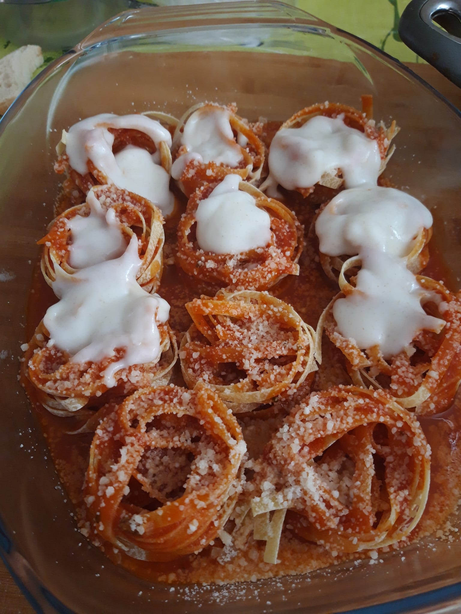 Siamo pronti per assemblare il tutto. Prendiamo una pirofila e facciamo uno strato di sugo: ora prendiamo i nostri nidi ( a crudo) e adagiamoli sulla pirofila cospargendo lo su ogni nido il sugo. Ora la besciamella. Fatto questo inforniamo. Dovrete infornare la pirofila a 180 gradi per 20 minuti in forno preriscaldo. Dopo 10 minuti di tempo aggiungete le polpettine. Alla potrete spolverare il tutto con del parmigiano grattugiato.