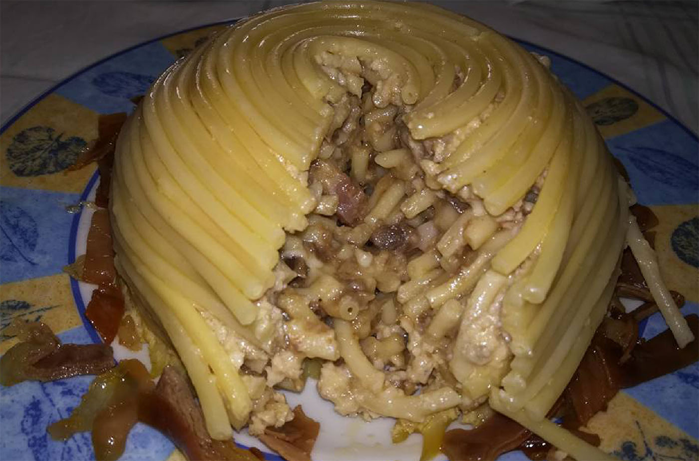 Mettete tutto nel tegame con il sugo di carne, insieme alle polpettine, e continuate la cottura per altri 5 minuti. Passate adesso alla farcia. Per prima cosa dovete preparare la besciamella. Tritate poi i 700 grammi di petto di pollo. Amalgamateli con i tre tuorli, il parmigiano grattugiato, un pizzico di noce moscata, sale, pepe e la besciamella precedentemente fatta e lasciata raffreddare. Scolate i bucatini al dente e imburrate uno stampo semisferico di 12 cm di altezza e 20 di diametro. Cominciate dal centro e arrotolate il primo bucatino a spirale. Continuate così finché non avrete ricoperto tutto lo stampo.