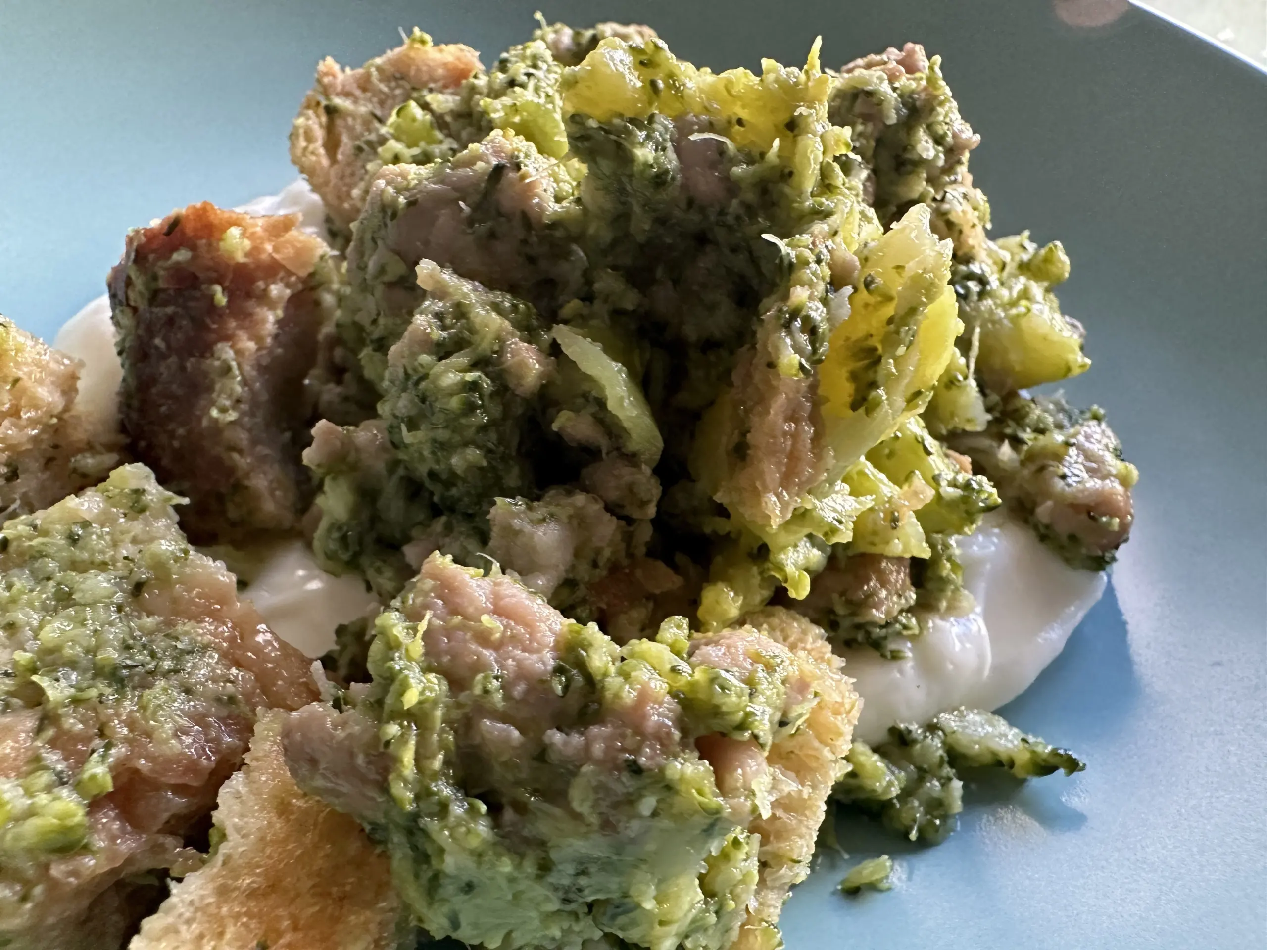 L’ultima fase prevede l’assemblaggio del tutto, mettete quindi il pane nella padella dove avete fatto cuocere broccoli e salsiccia. Se รจ necessario e se avete optato per il panno fritto, potrebbe risultare troppo secco, quindi bagnatelo con un po’ di acqua di cottura dei broccoli. Se invece avete usato il pane sbollentato, non ce ne sarร bisogno.