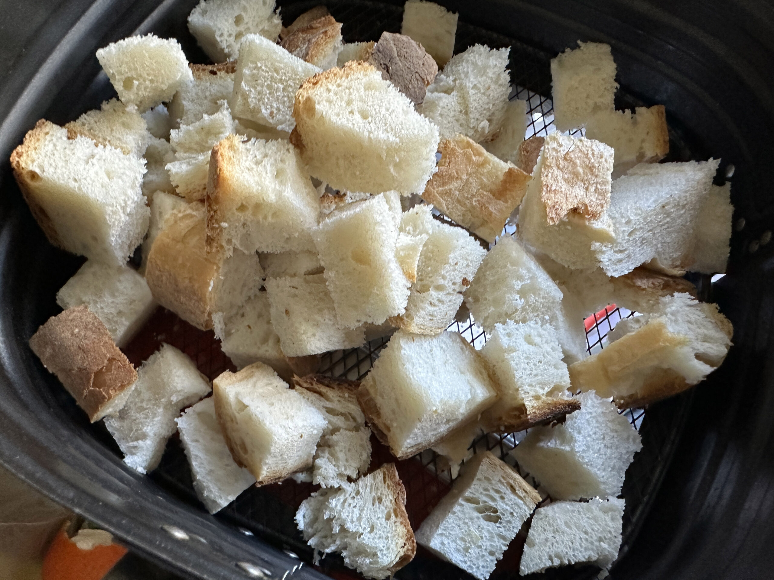 Noi abbiamo preferito fare dei crostini: abbiamo tagliato il pane a tocchetti e unti con dell’olio di oliva: poi abbiamo cotto in friggitrice ad aria a 200 gradi per 8 minuti ( ovviamente dipende anche quanto รจ potente la vostra friggitrice). La ricette originale, perรฒ, prevede che il pane vada “bollito” per 1 o 2 secondi nell’acqua dove avete cotto i broccoli. Anticamente la ricetta era di riciclo, per non buttare il pane che per giorni albergava in dispensa.