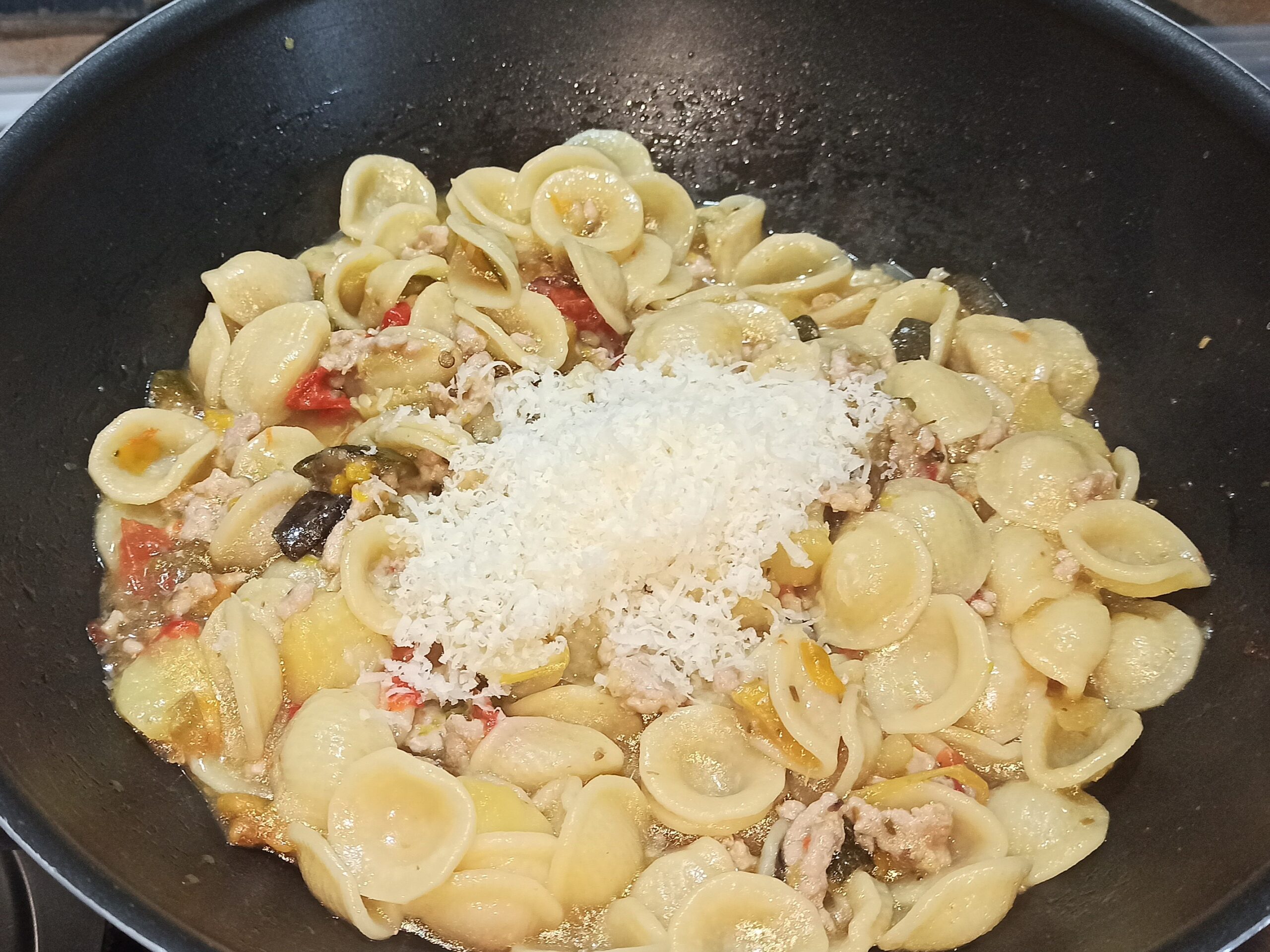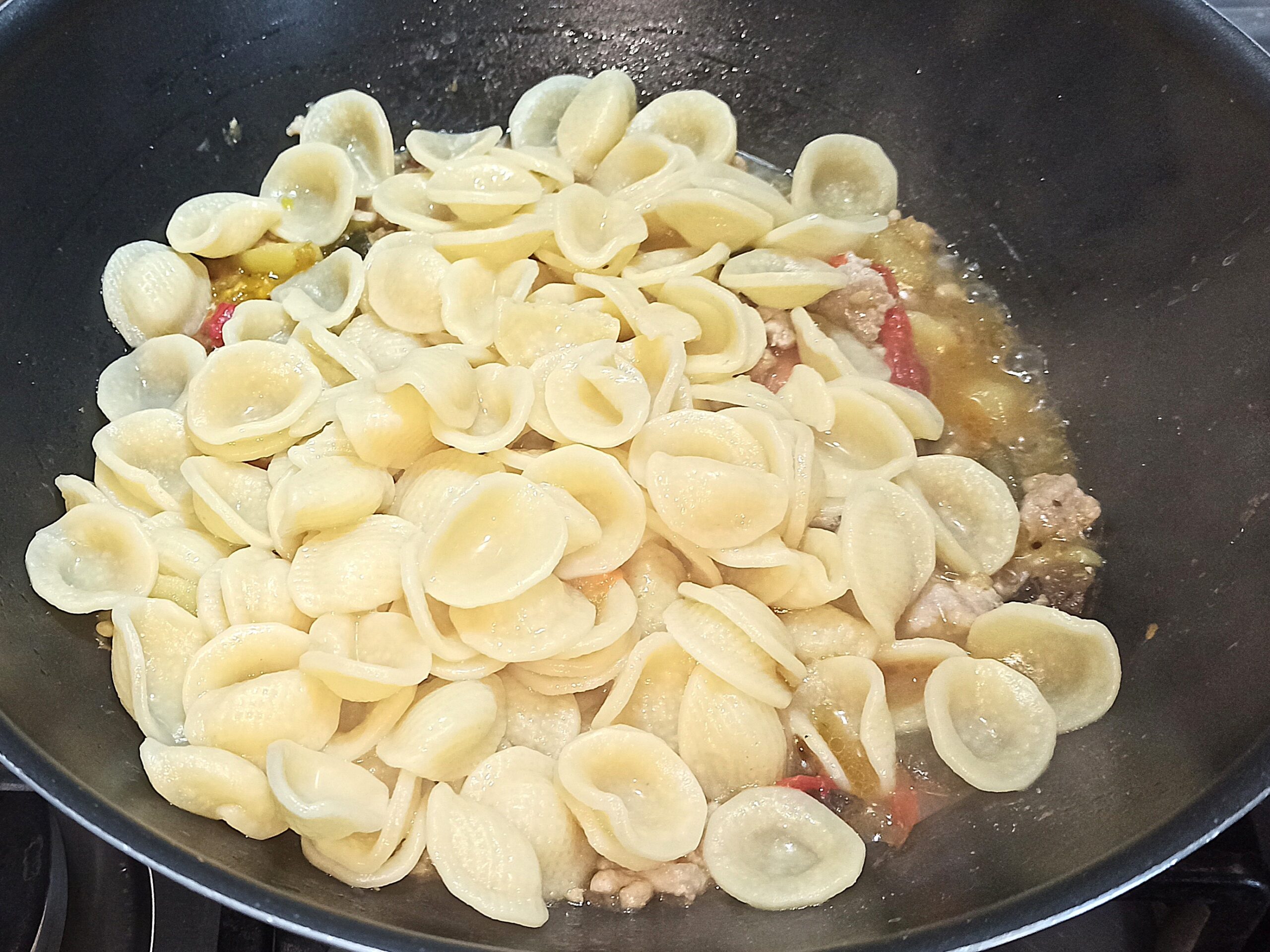 Cuocete le orecchiette in abbondante acqua salata, colatele al dente direttamente nella padella.