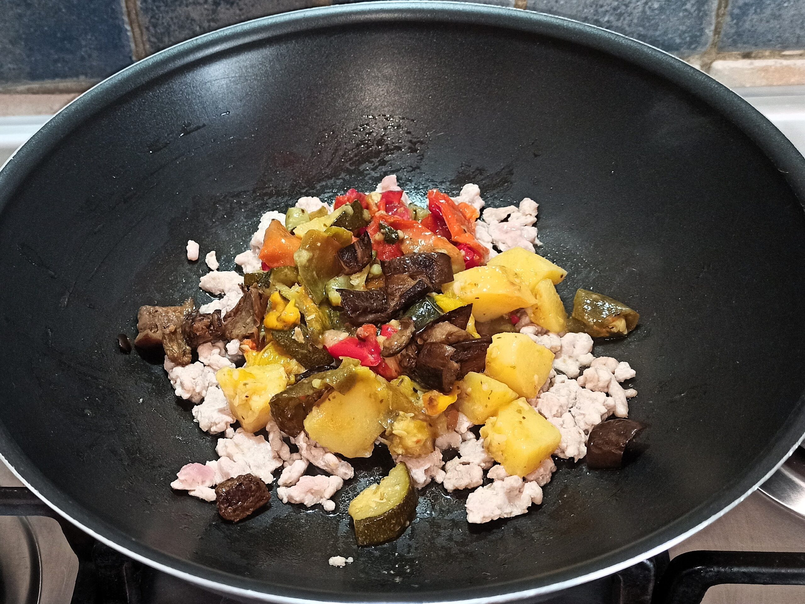Appena l’alcol sarà evaporato, aggiungete le verdure, regolate di sale, mescolate a fate insaporire a fiamma bassa.