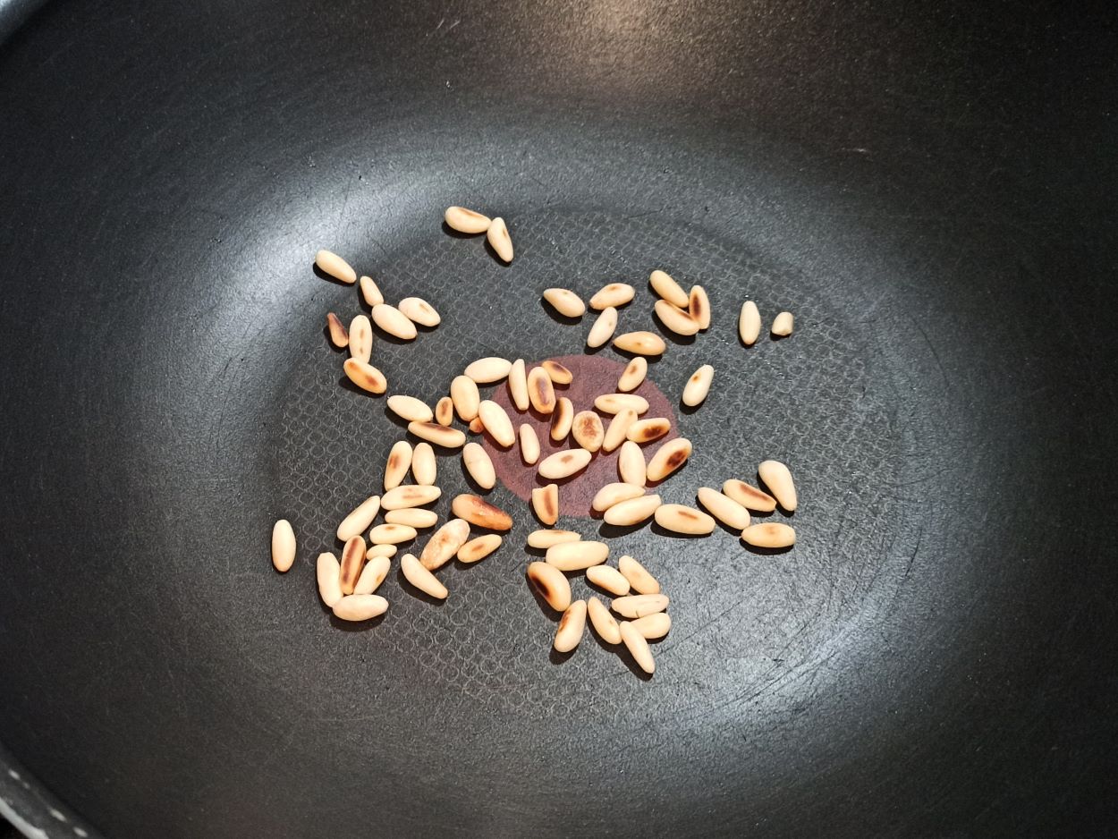In un’altra padella, tostate i pinoli, facendo attenzione a non bruciarli.