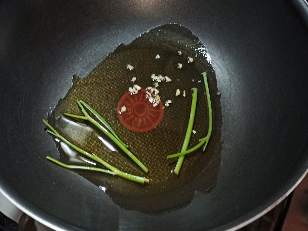 In una capiente padella, mettete un paio di giri abbondanti di olio evo, aggiungete i gambi del prezzemolo, e l’aglio tritato.