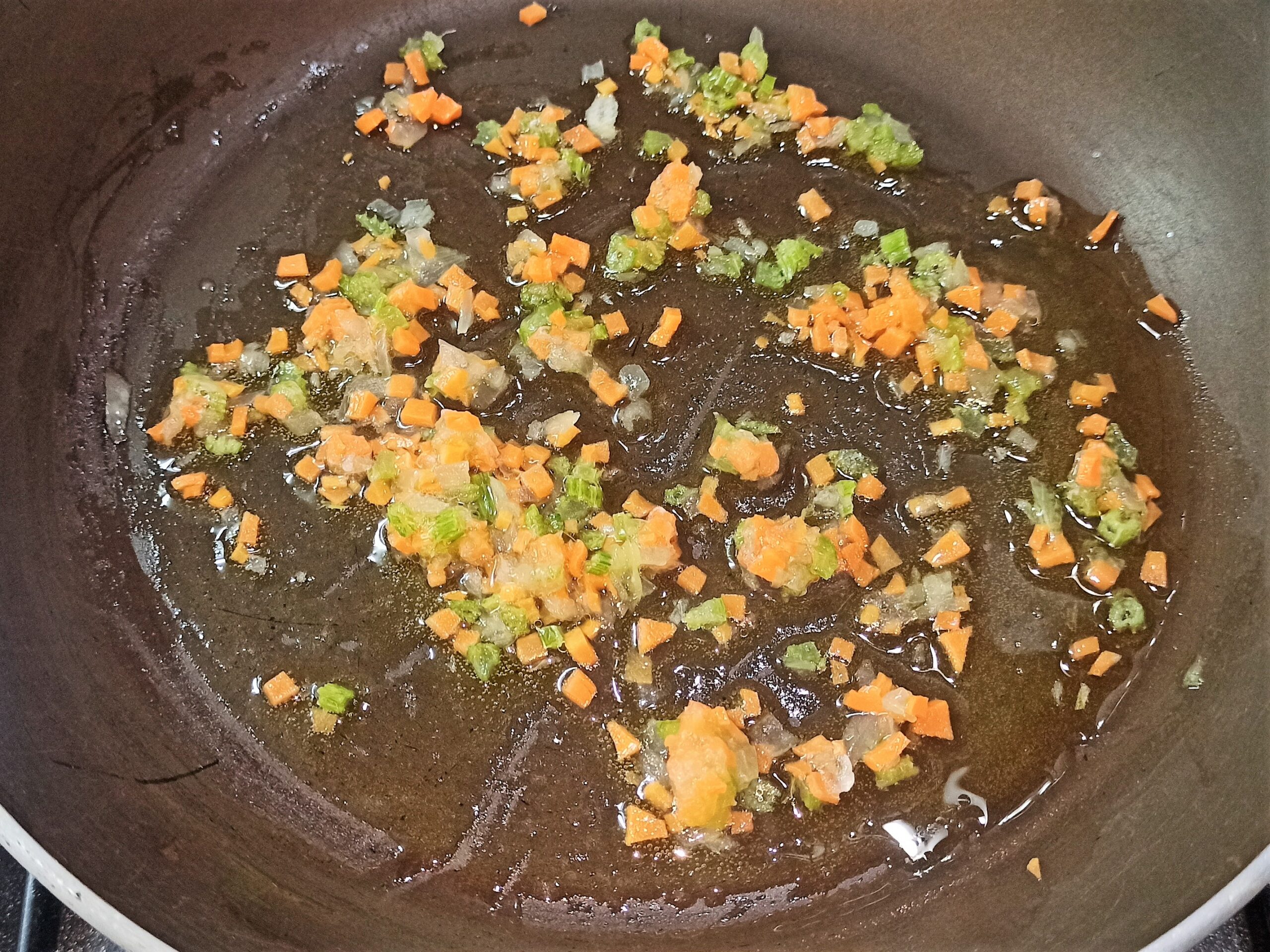 In una capiente padella, mettete un giro d’olio evo, aggiungete le verdure tritate, e fate soffriggere per un minuto.