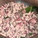 Per preparare i paccheri al ragù di cinghiale, iniziate a tagliare a pezzetti piccoli la carne. Poi mettetela in una ciotola, ricoprite la carne con aceto e acqua, in parti uguali aggiungete anche un poco di sale doppio , qualche fogliolina di alloro, e lasciatela riposare in frigo per almeno quattro ore. Trascorso questo tempo sciacquate la carne sotto abbondante acqua corrente. Mettetela in una capiente pentola, aggiungete la sugna, e fate sfrigolare a fiamma vivace.