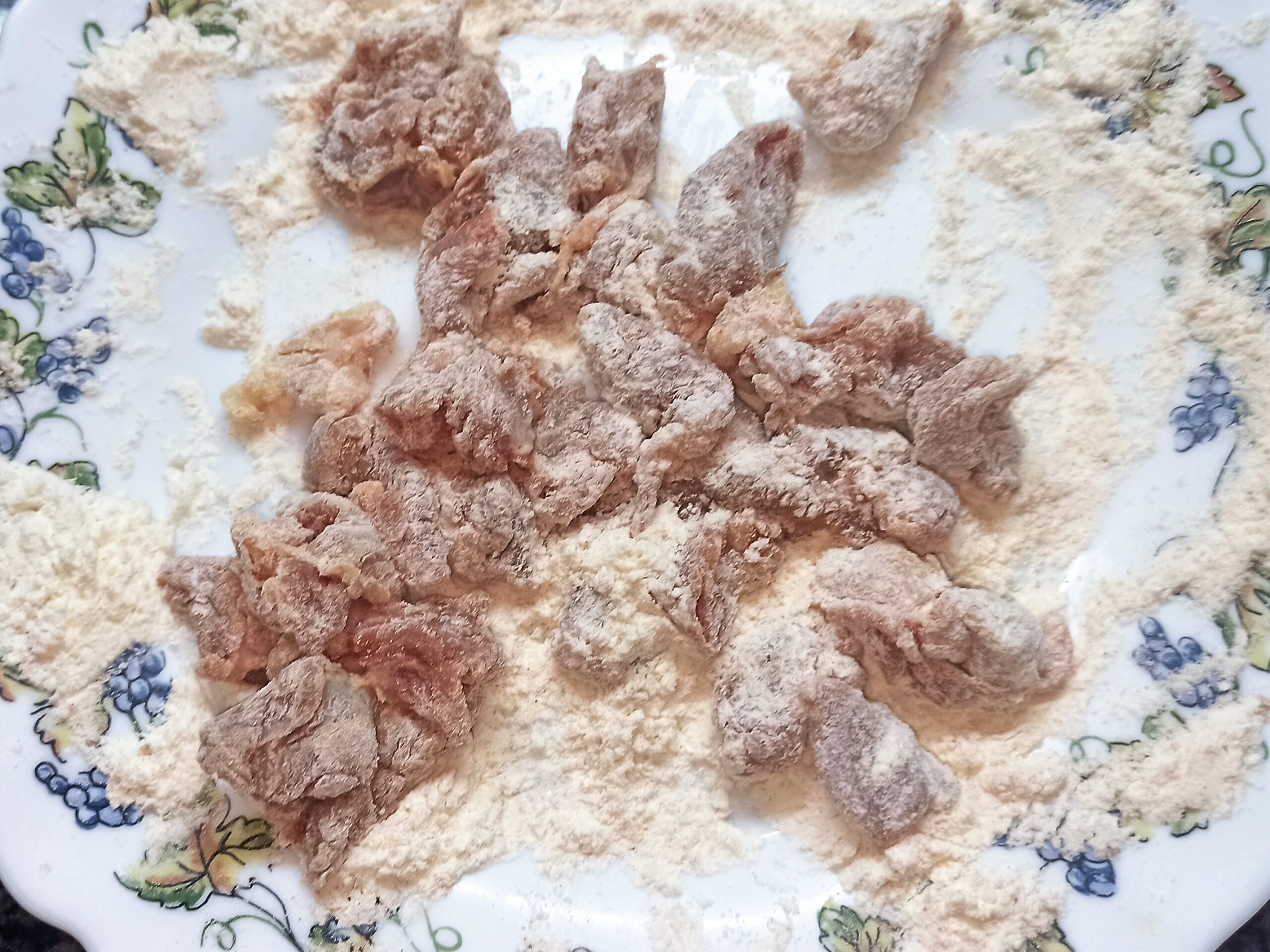 Per preparare i paccheri al sugo di pollo e peperoni, iniziate a tagliare a pezzetti piccoli la polpa di pollo. In un piatto mettete la farina, un pizzico di sale e un pizzico di pepe, mescolate bene e infarinate i pezzetti di pollo.